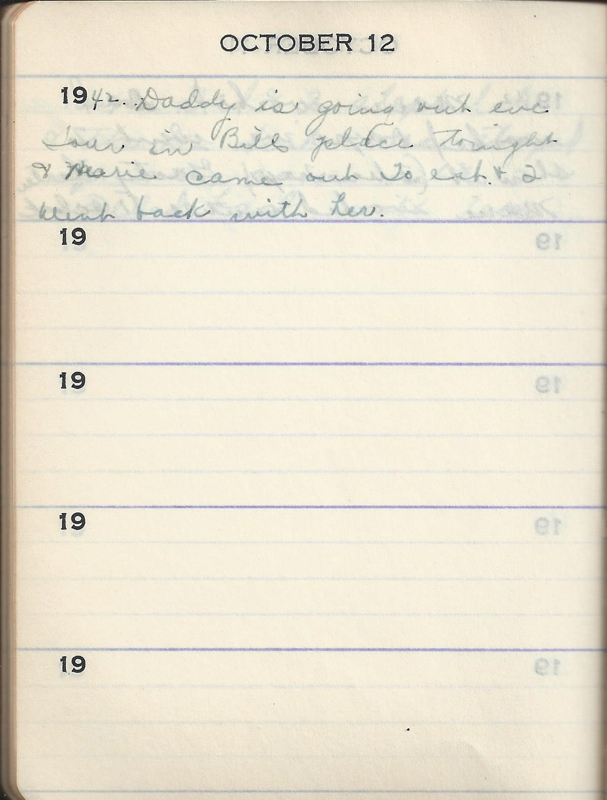 1942 Daddy is going out eve Tour in Bills place tonight & Marie came out To eat & I went back with her.