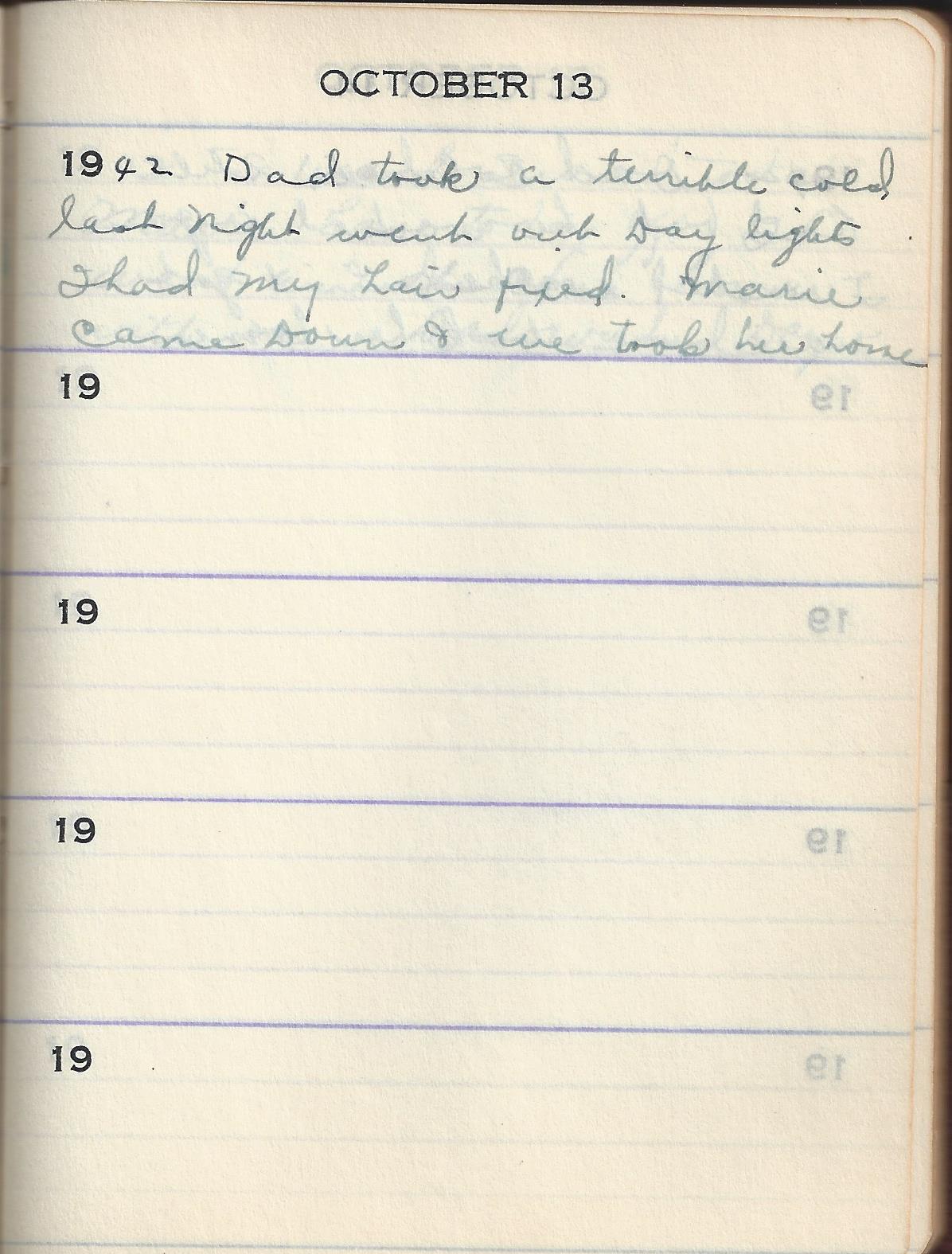 1942 Dad took a terrible cold last Night went out Day lights I had My hair fixed. Marie came Down & we took her home