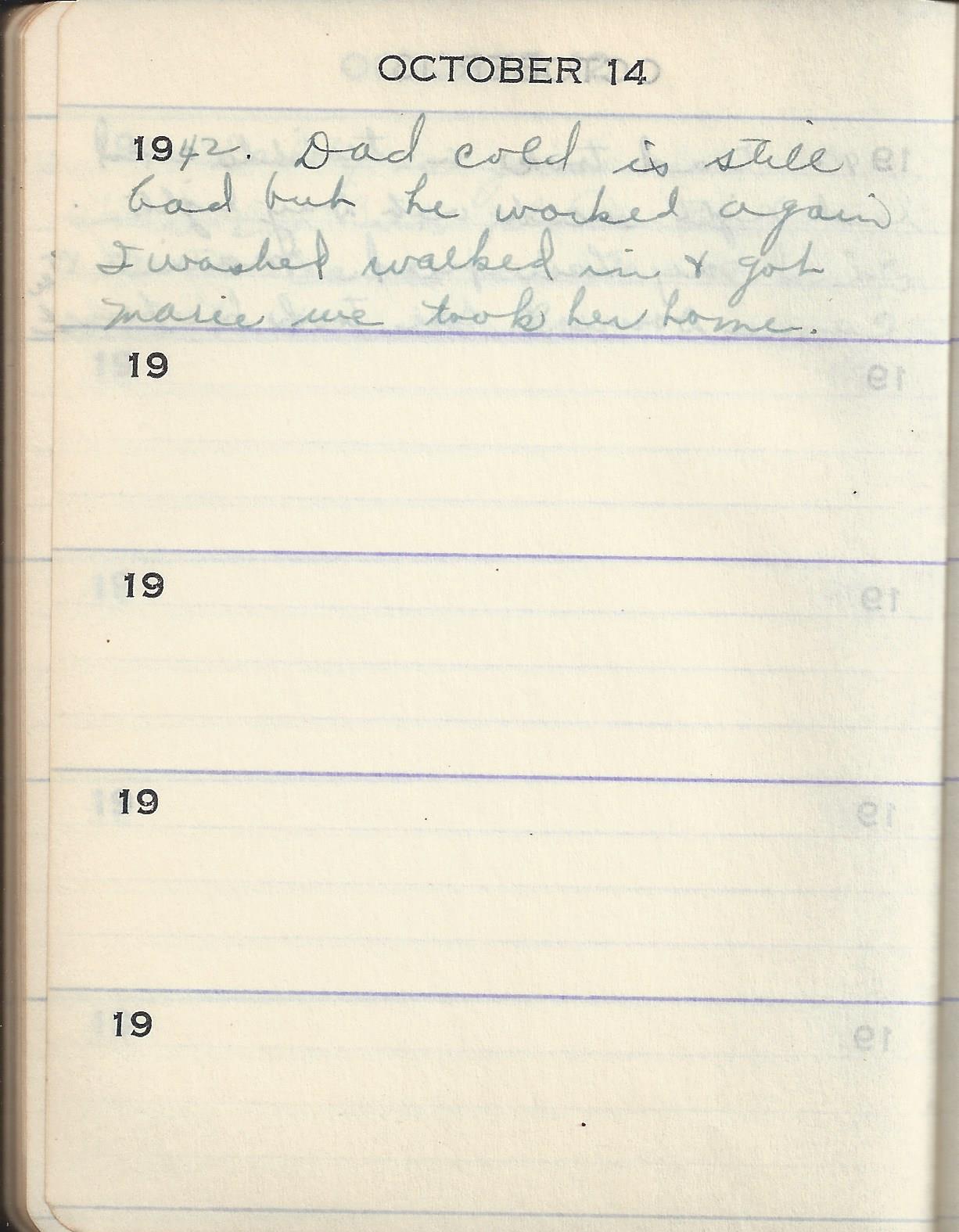 1942 Dad cold is still bad but he worked again I washed walked in & got Marie we took her home.