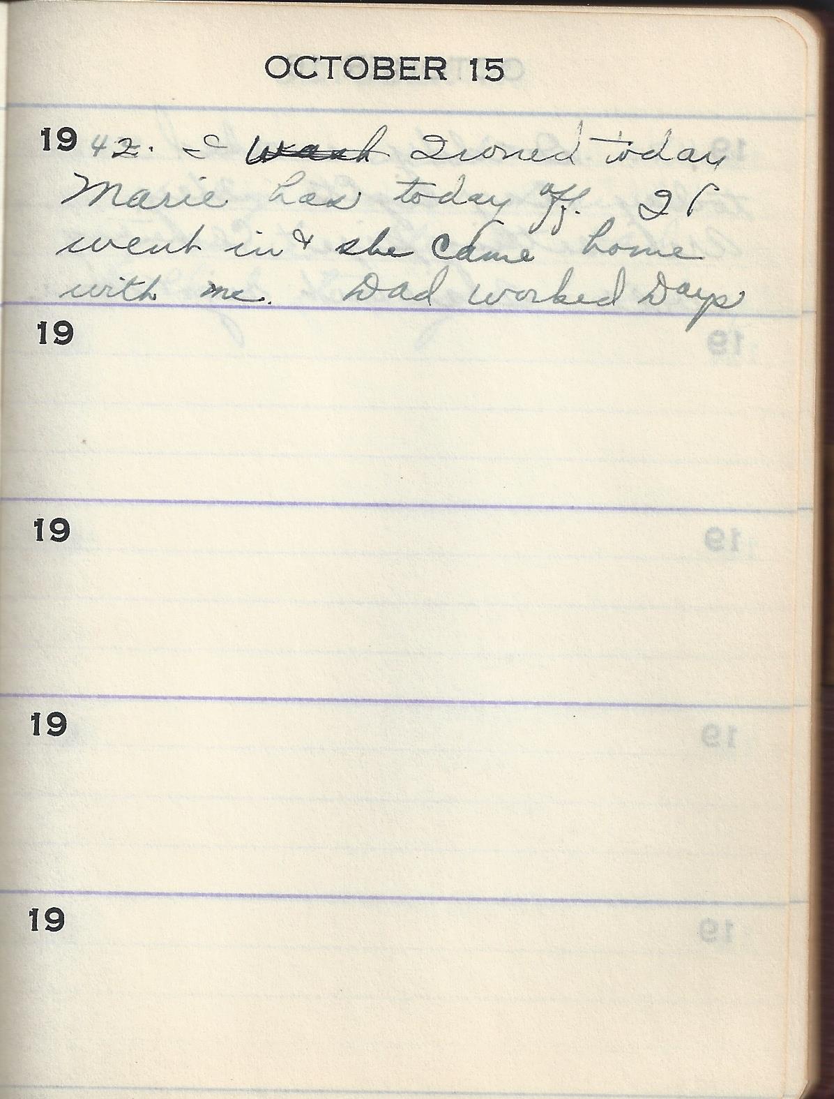 1942 I wash Ironed today Marie has today off. I went in & she came home with me. Dad worked Days