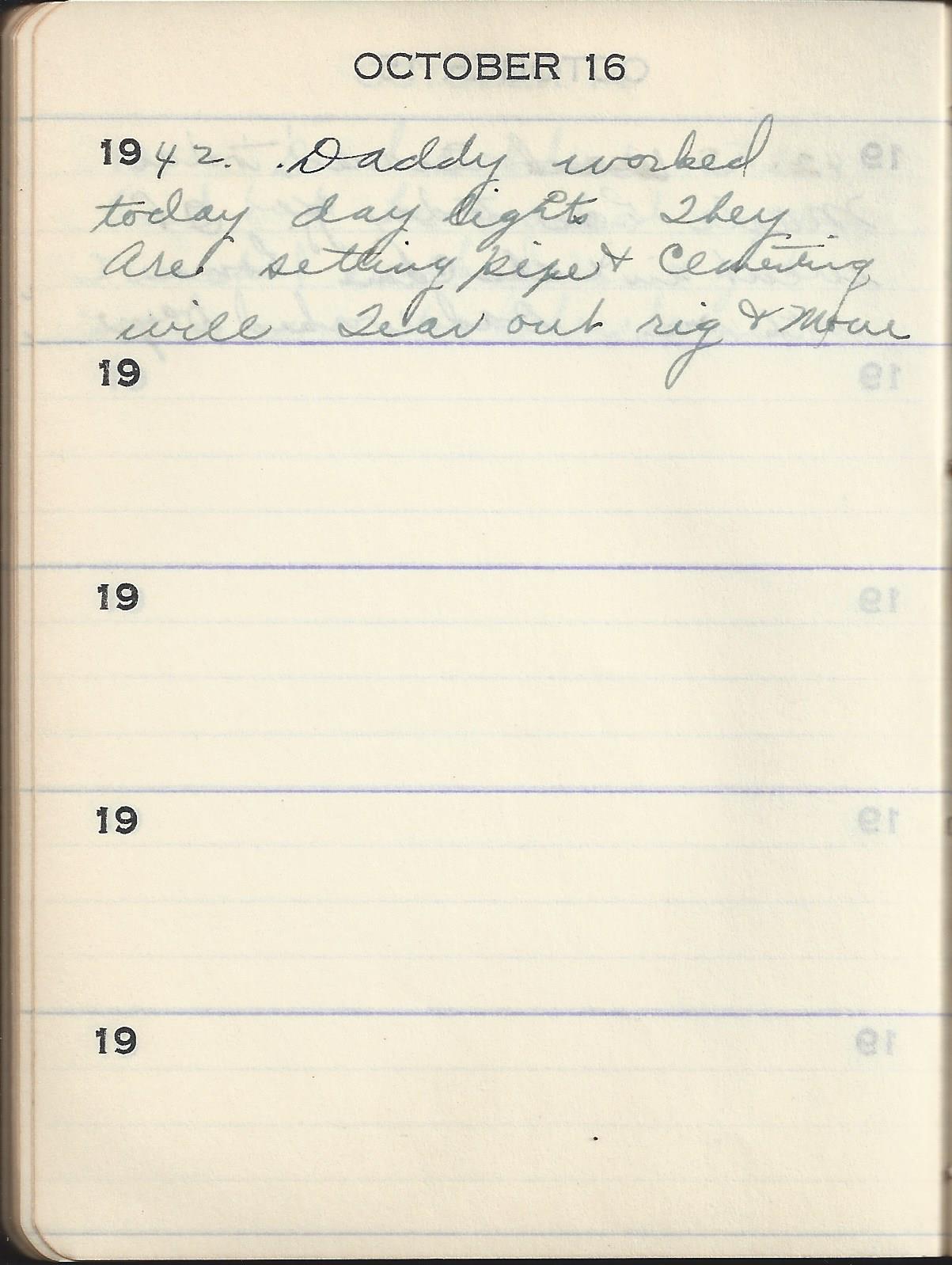 1942 Daddy worked today day lights They are setting pipe & cementing will Tear out rig & Move