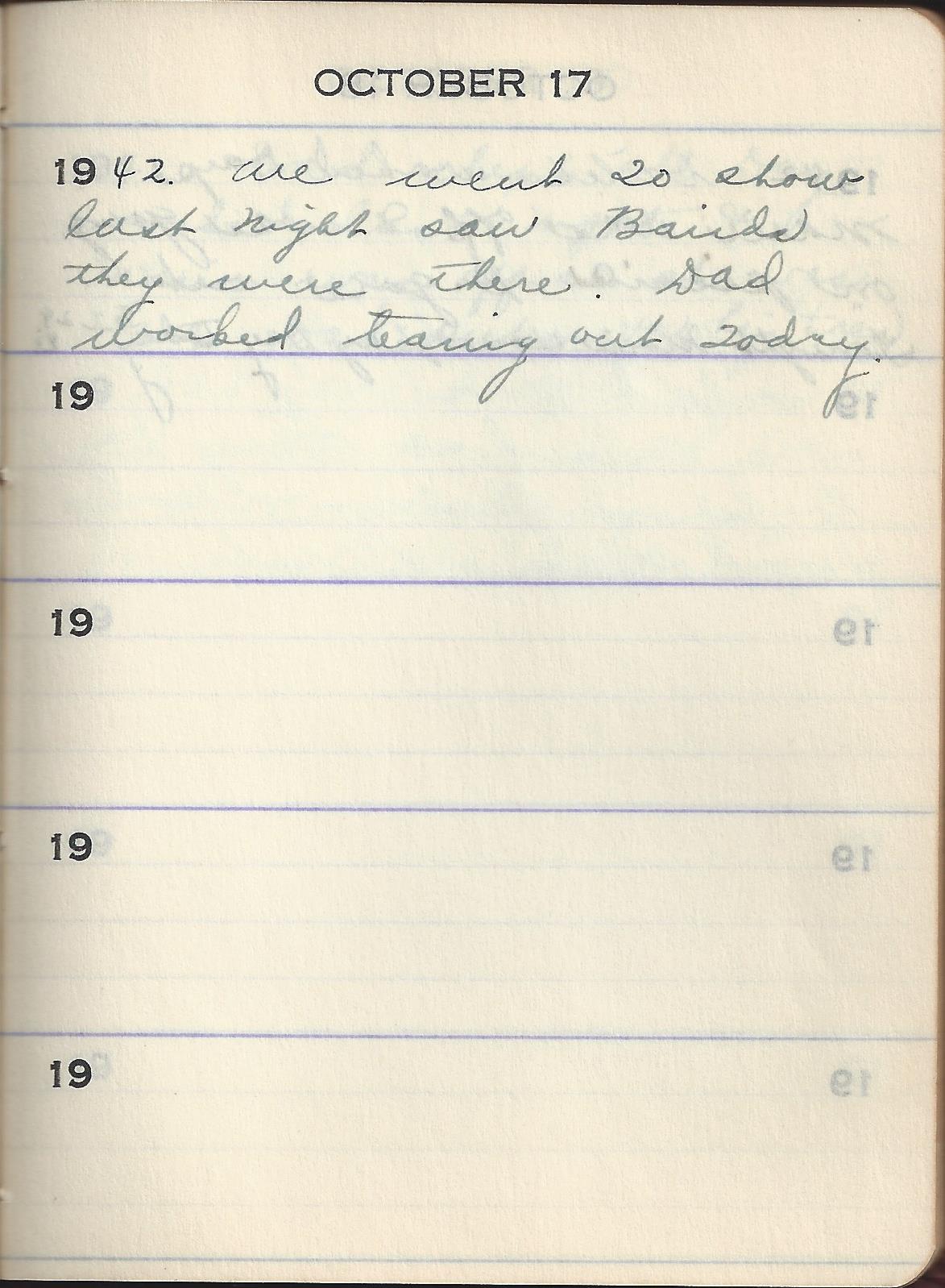 1942 We went To show last Night saw Bairds they were there. Dad worked tearing out today.