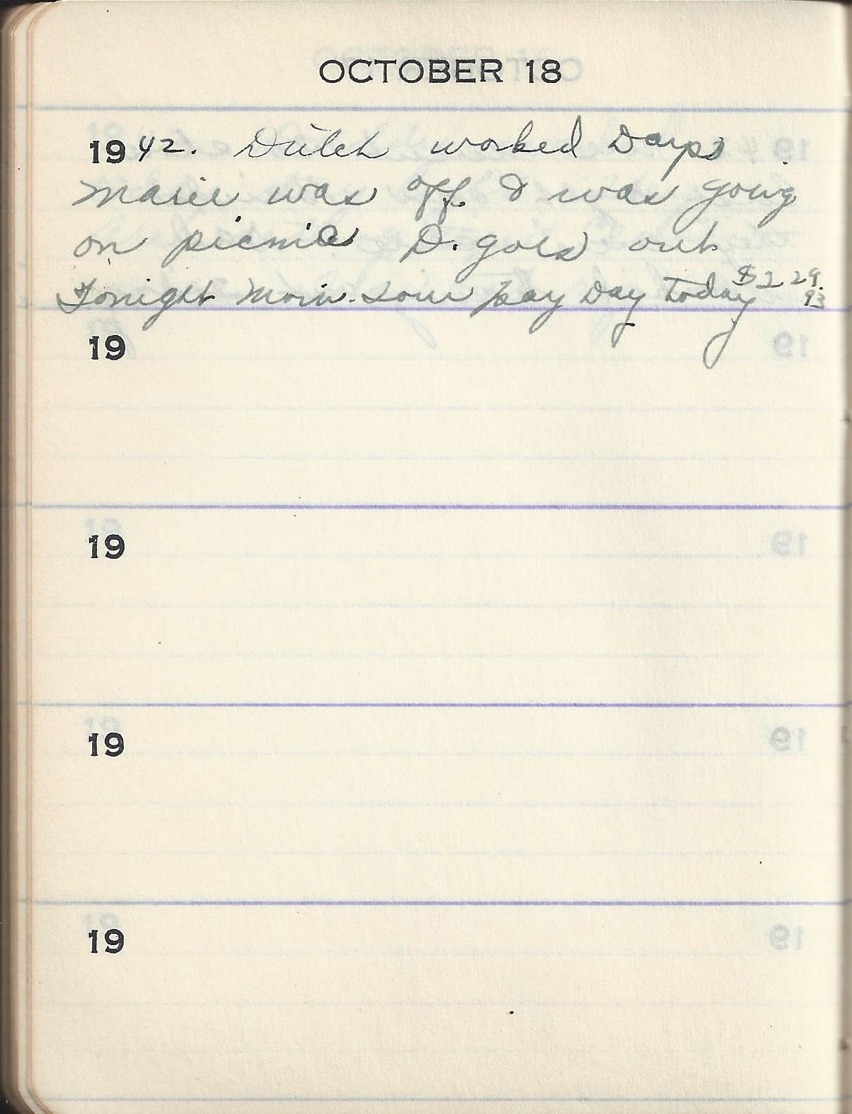 1942 Dutch worked Days Marie was off was going on picnic D. goes out Tonight Morn. Tour pay Day today $228.83