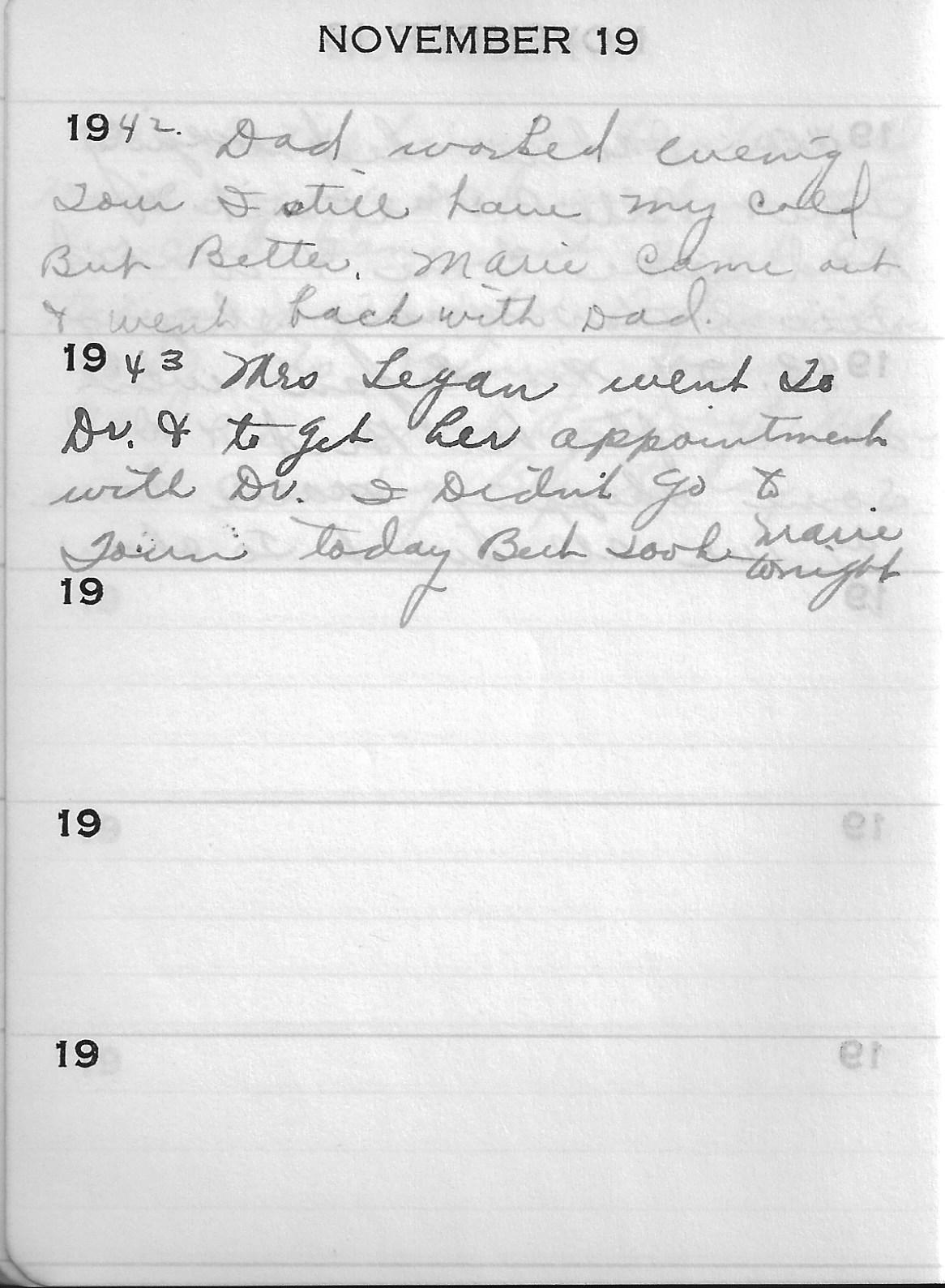 1943 – Mrs Logan went to Dr. & to get her appointment with Dr. I Didn’t go to town today But … Marie Wright