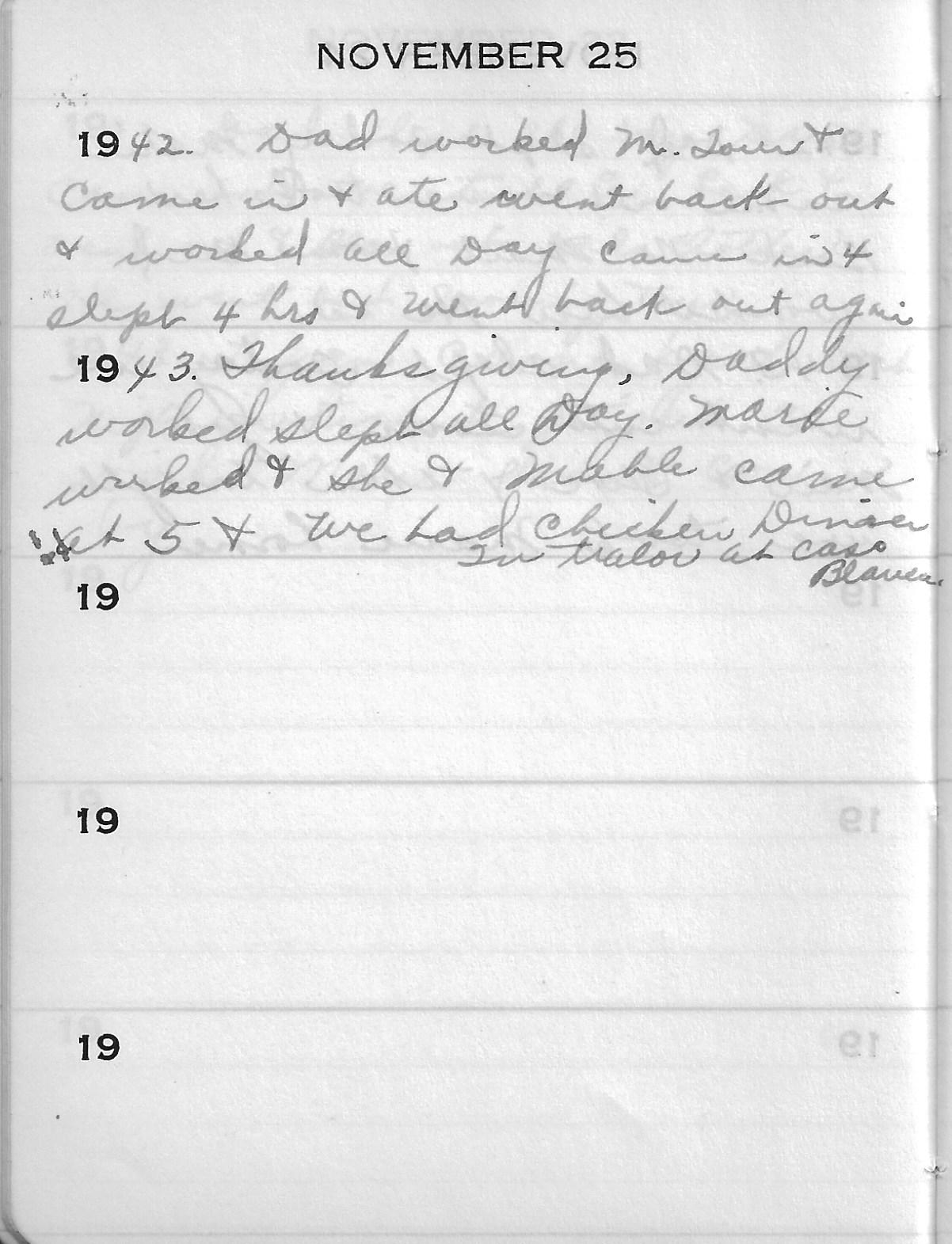 1943 – Thanksgiving. Daddy worked slept all Day. Marie worked & she & Mable came at 5 & we had chicken Dinner in tralor at Caso Blavens (?)