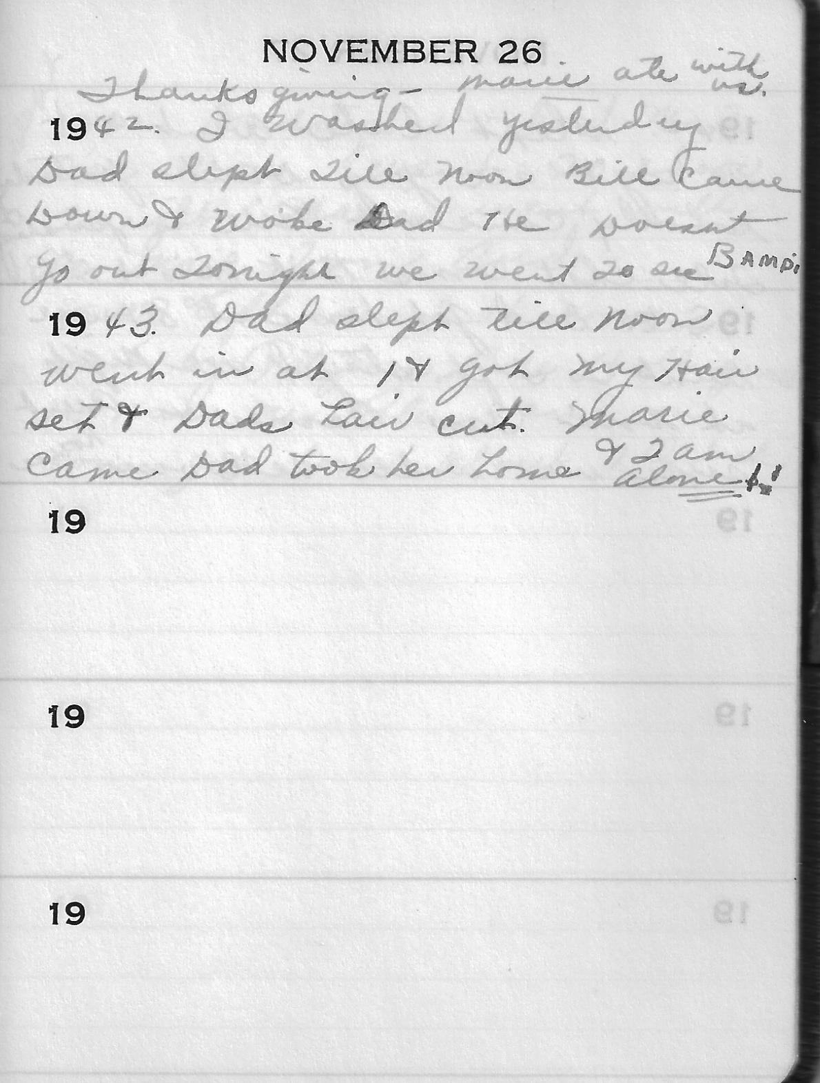 1942 – Thanksgiving – Marie ate with us. I washed yesterday Dad slept Till Noon Bill came Down & woke Dad He Doesnt go out Tonight We went to see Bambi.
