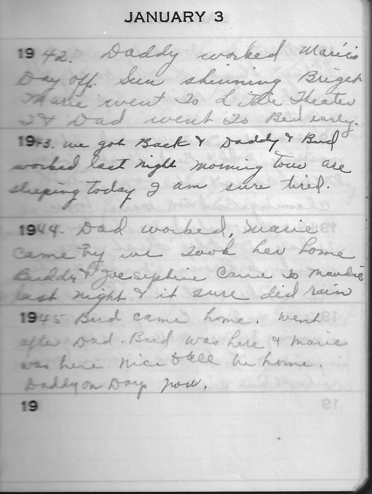 1942 –Daddy worked Maries Day off. Sun shining Bright Marie went To Little Theater I & Dad went To Bed early.