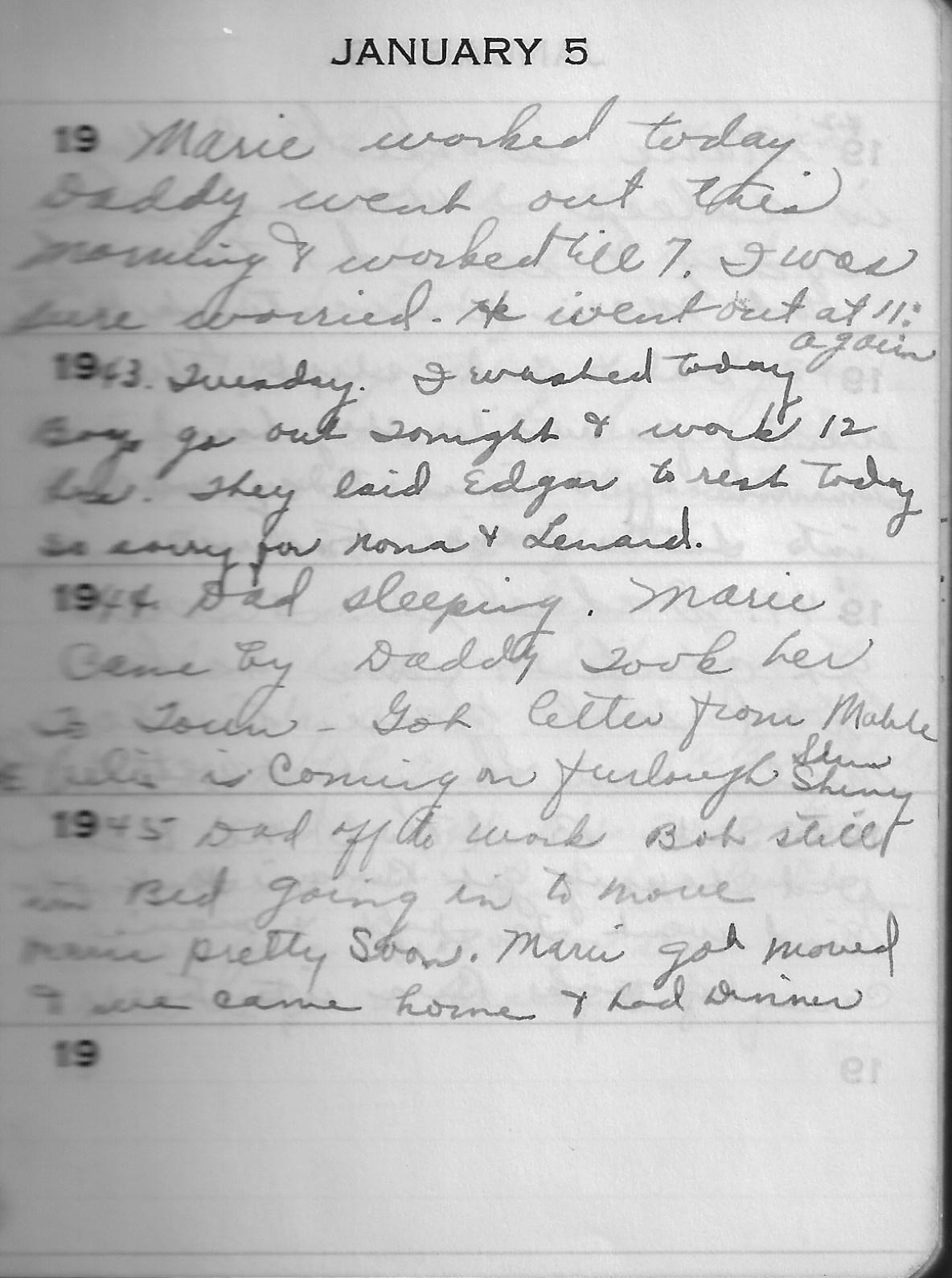 1942 –Marie worked today Daddy went out this morning & worked till 7. I was sure worried. He went out at 11: again