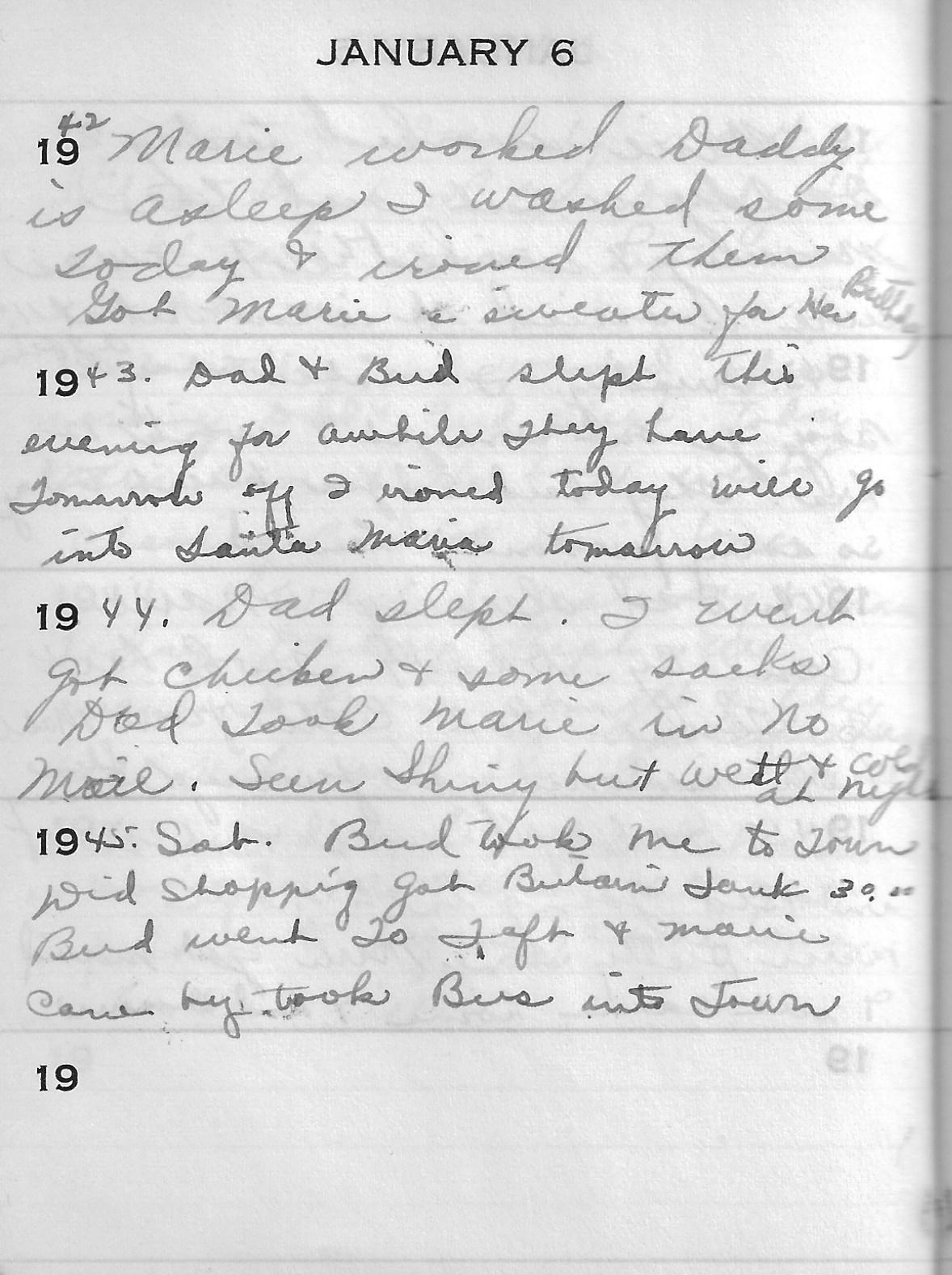 1942 –Marie worked Daddy is asleep I washed some Today & ironed them Got Marie a sweater for Her Birthday