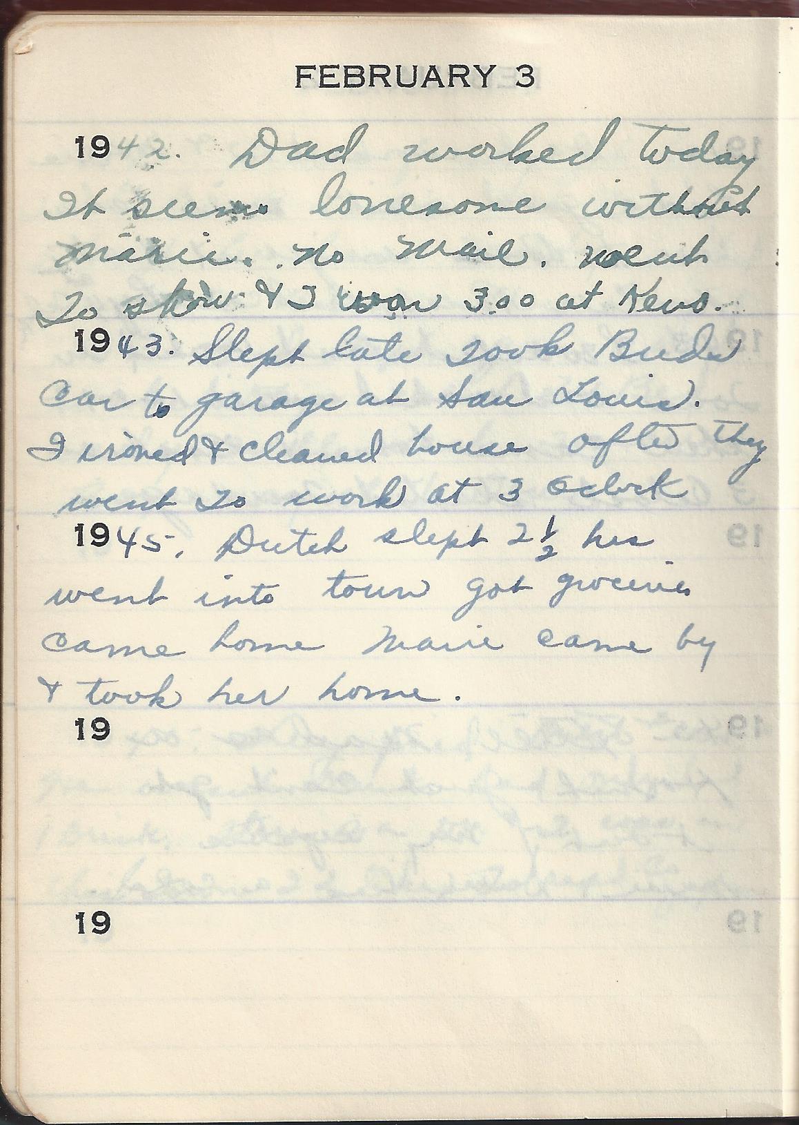1943 Slept late Took Buds car to garage at San Louis. I ironed & cleaned house after they went To work at 3 oclock