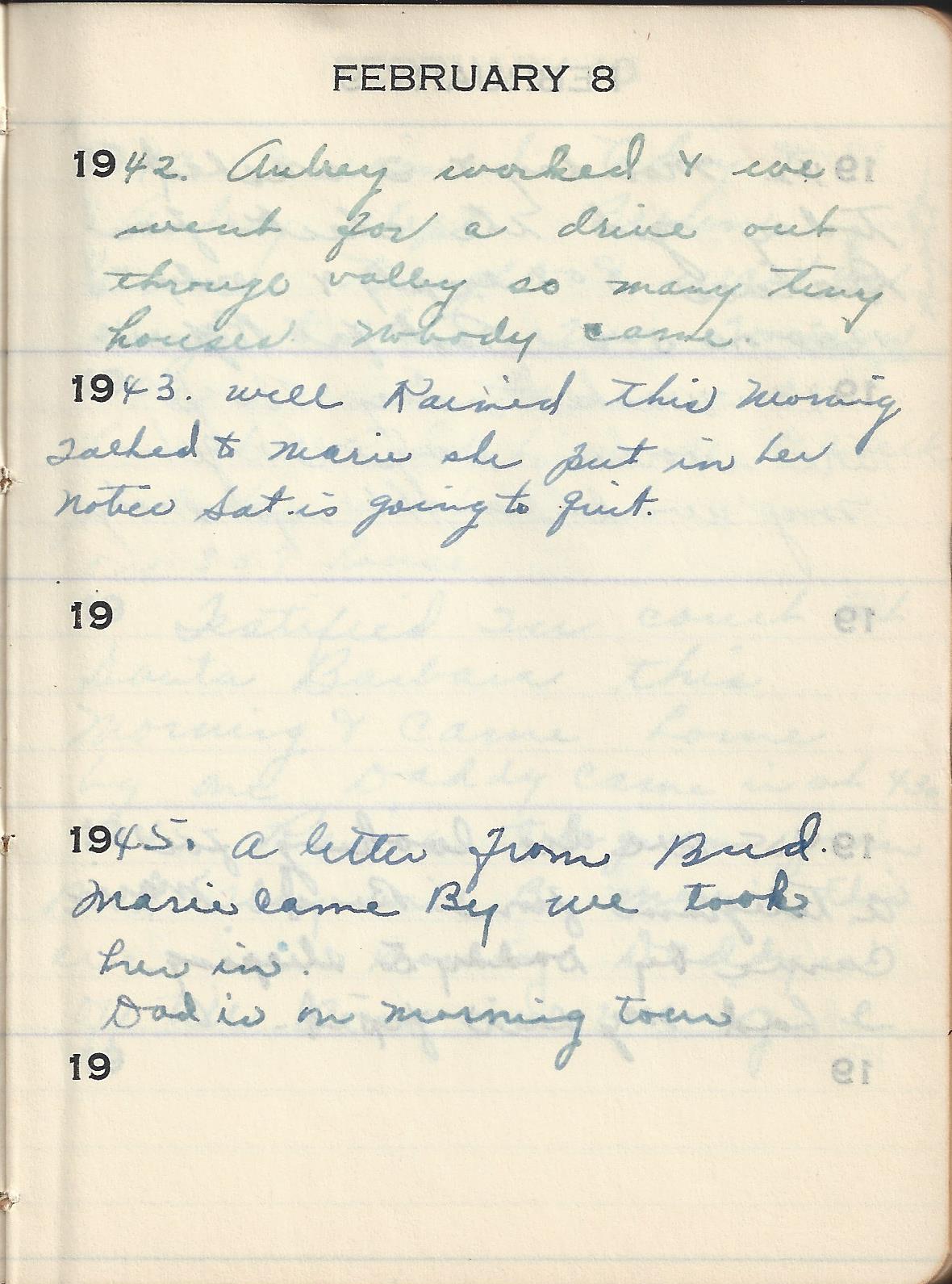 1942 Aubrey worked & we went for a drive out through valley so many tiny houses. Nobody came.