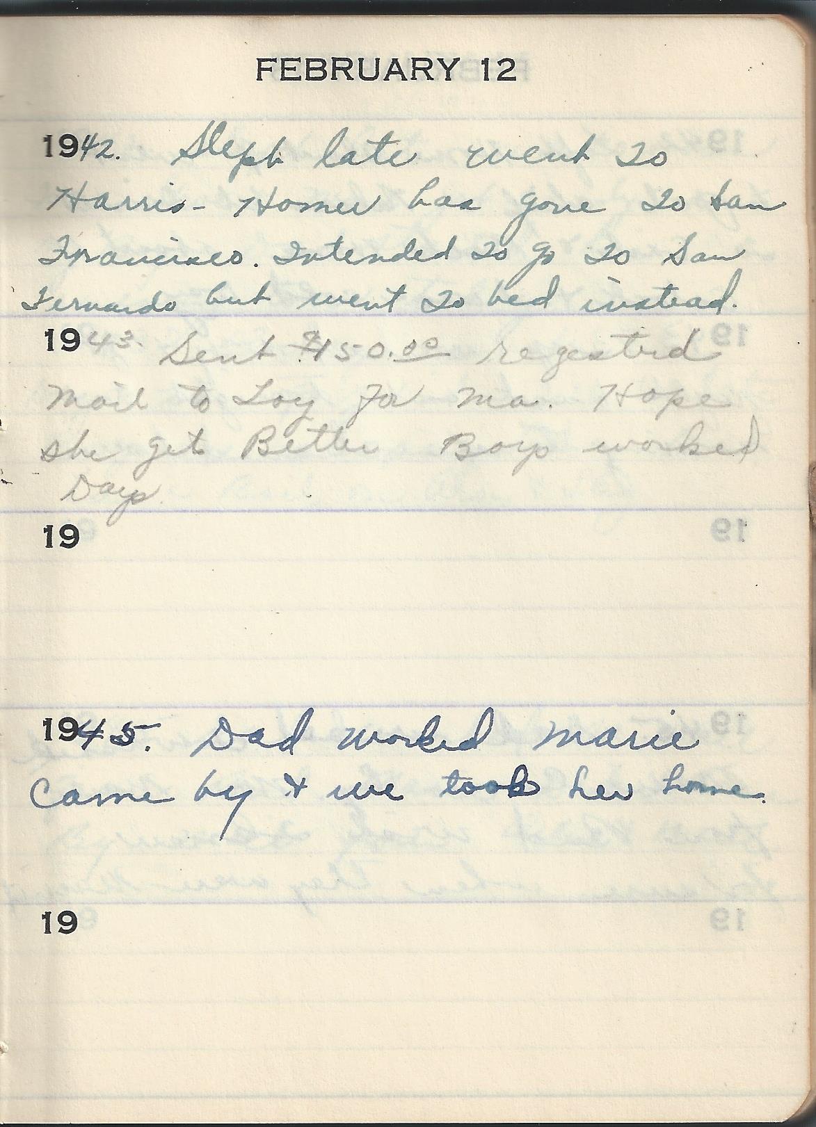 1942 Slept late went To Harris. Homer has gone To San Francisco. Intended To go To San Fernando but went To bed instead.