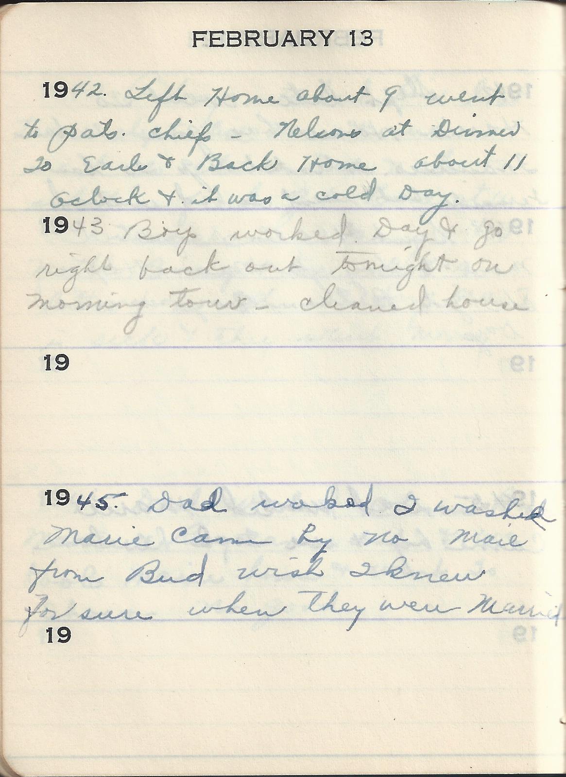1945 Dad worked I washed Marie came by no mail from Bud wish I knew for sure when they were married