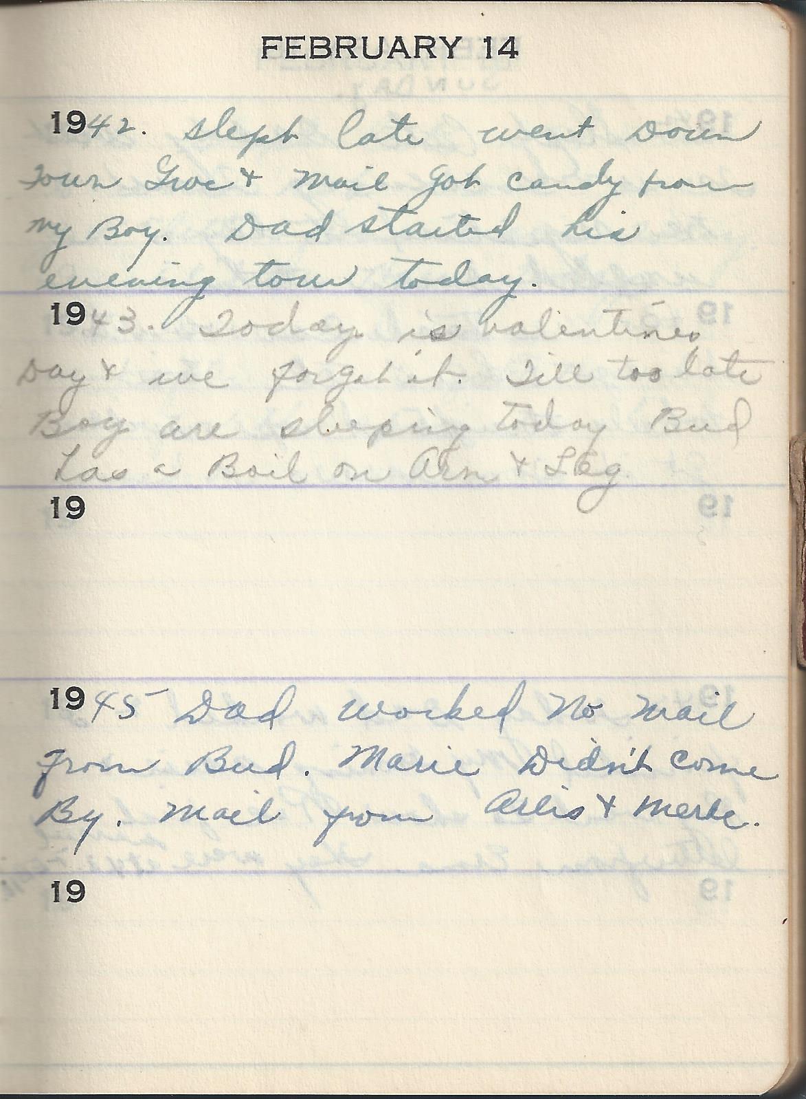 1943 Today is vanentines Day & we forgot it. Till too late Boy are sleeping today Bud has a boil on Arm & Leg.