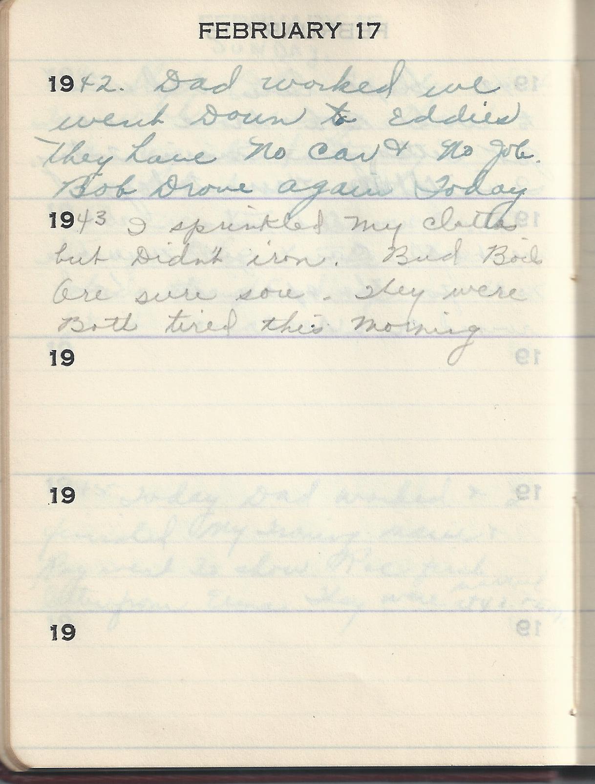 1943 I sprinkled my clothes but Didn’t iron. Bud Boils are sure sore. The were Both tired this morning