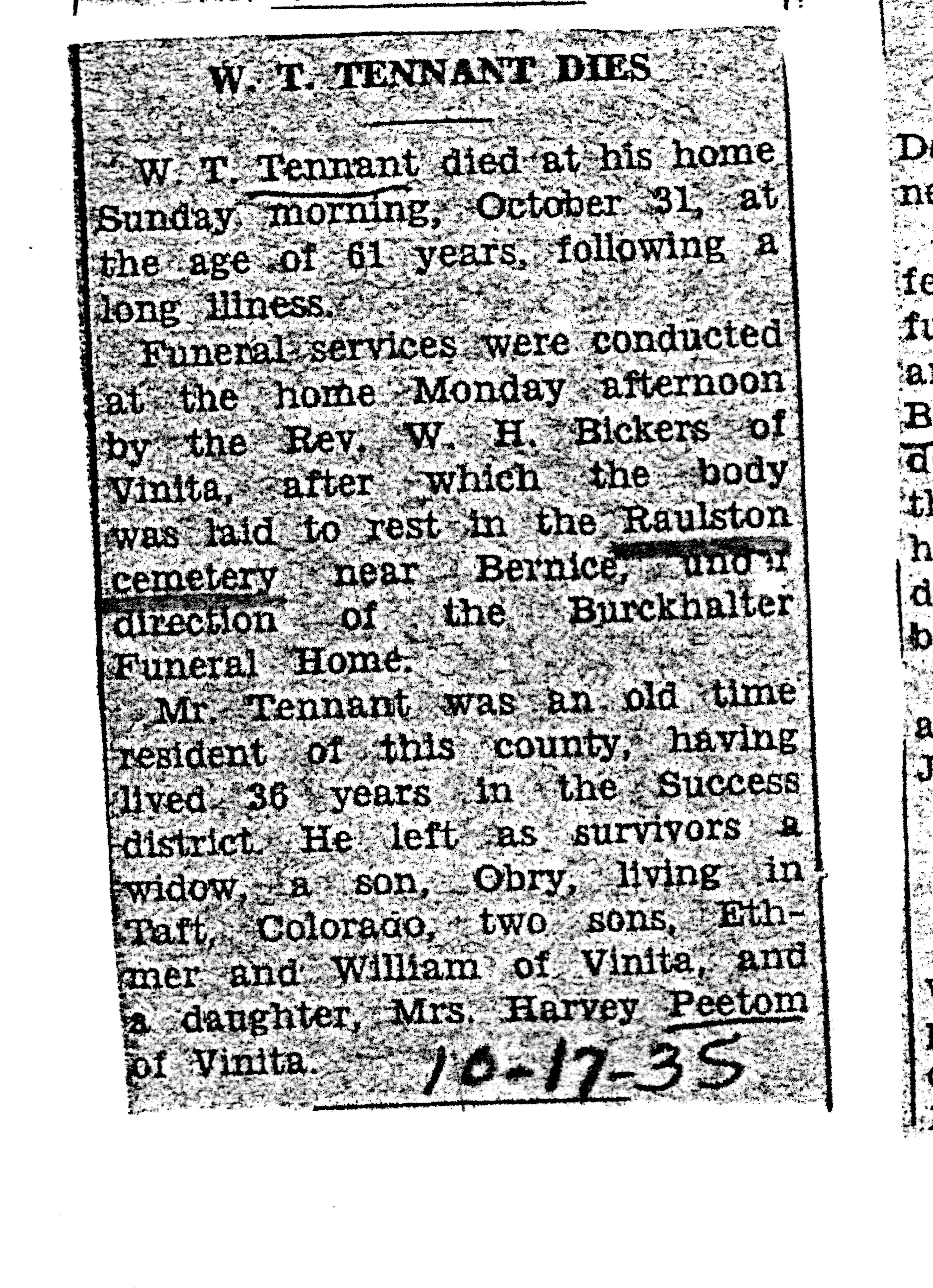 Mr. Tennant was an old time resident of this county, having lived 36 years in the Success District. He left as survivors a widow, a son, Obry, living in Taft, Colorado, two sons, Ethmer and William of Vinita, and a daughter, Mrs. Harvey Peetom of Vinita.