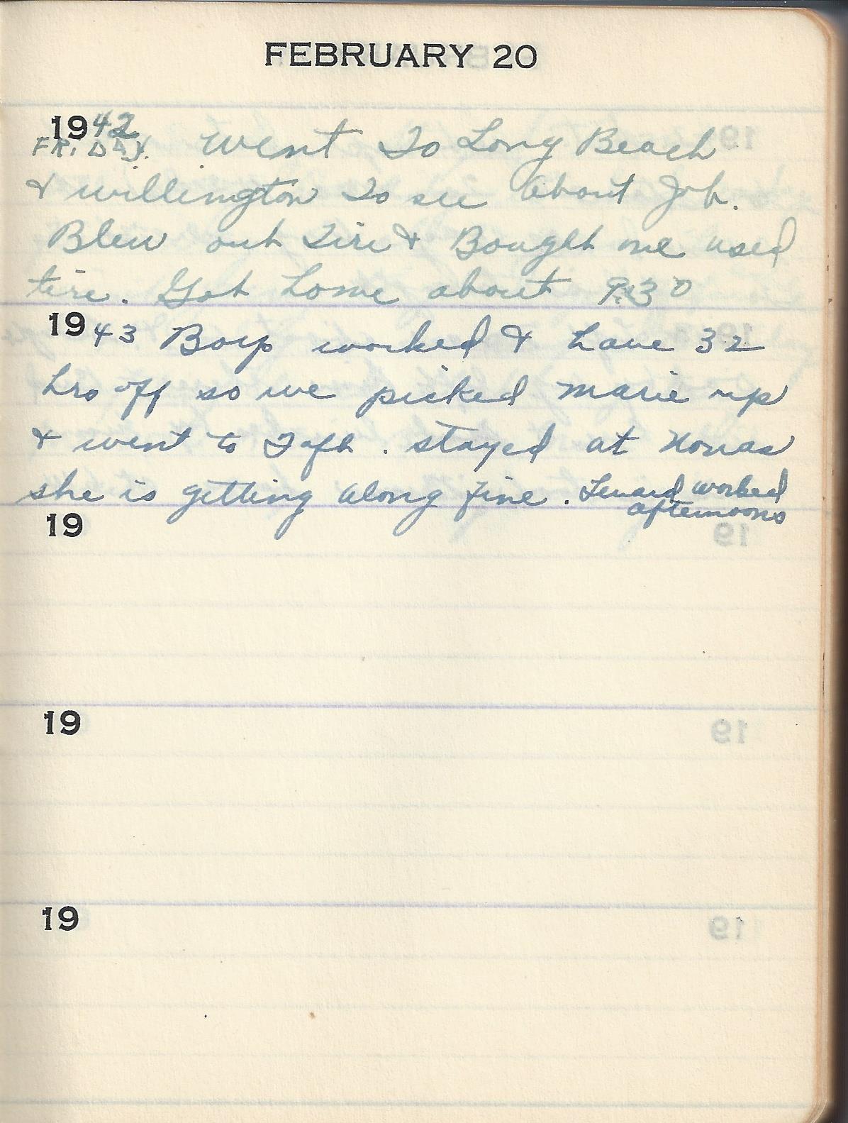 1942 FRIDAY Went To Long Beach & Willington To see about Jo. Blew out Tire & Bought one used tire. Got home about 9:30