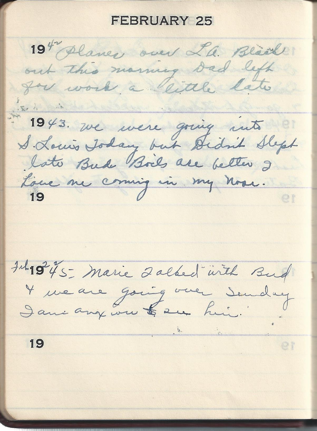 It is strange to imagine living with blackouts and the risk of attack during war but Grama just adds this comment in 1942 in a matter-of-fact way. 1943 S. Louis is really San Luis Obispo.