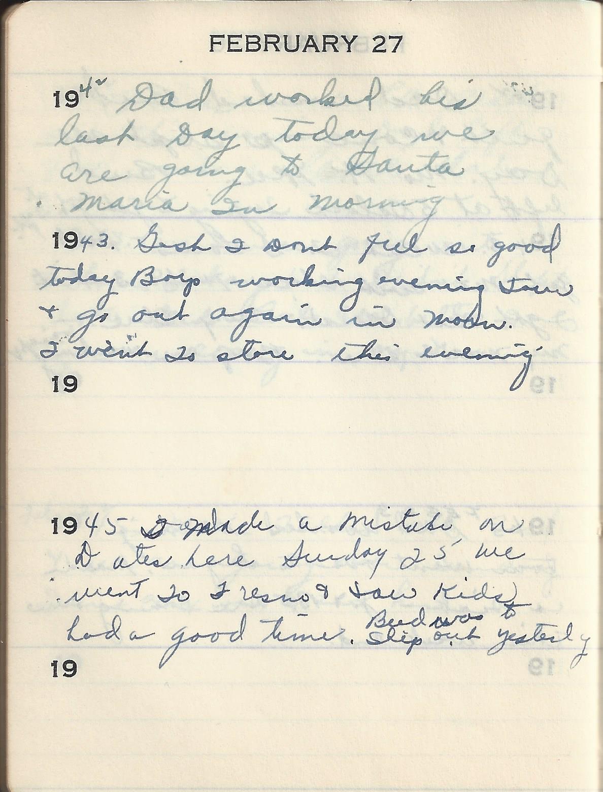 1945 I made a mistake on Dates here Sunday 25 We went To Fresno & saw Kids Had a good time. Bud was ship out yesterday