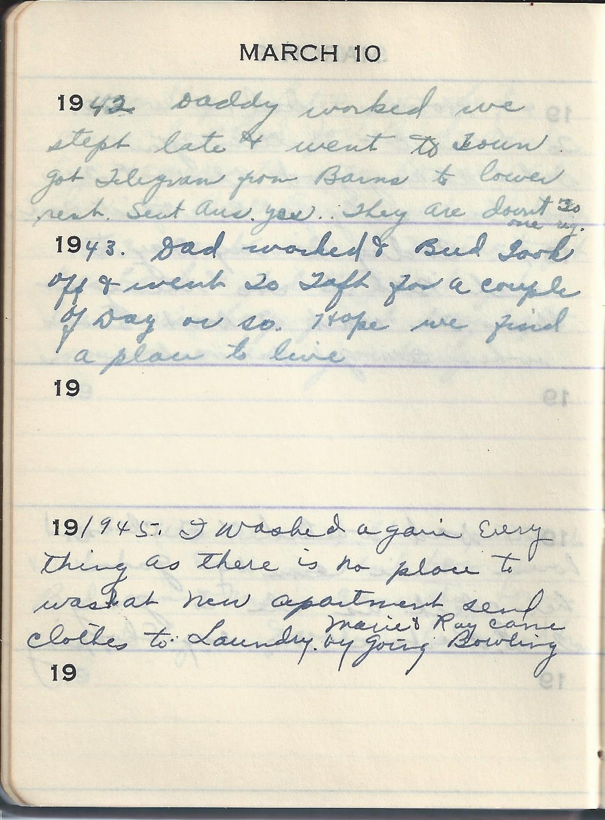 1945 I washed again Every thing as there is no place to wash at new apartment send clothes to Laundry. Marie & Roy came by going Bowling.