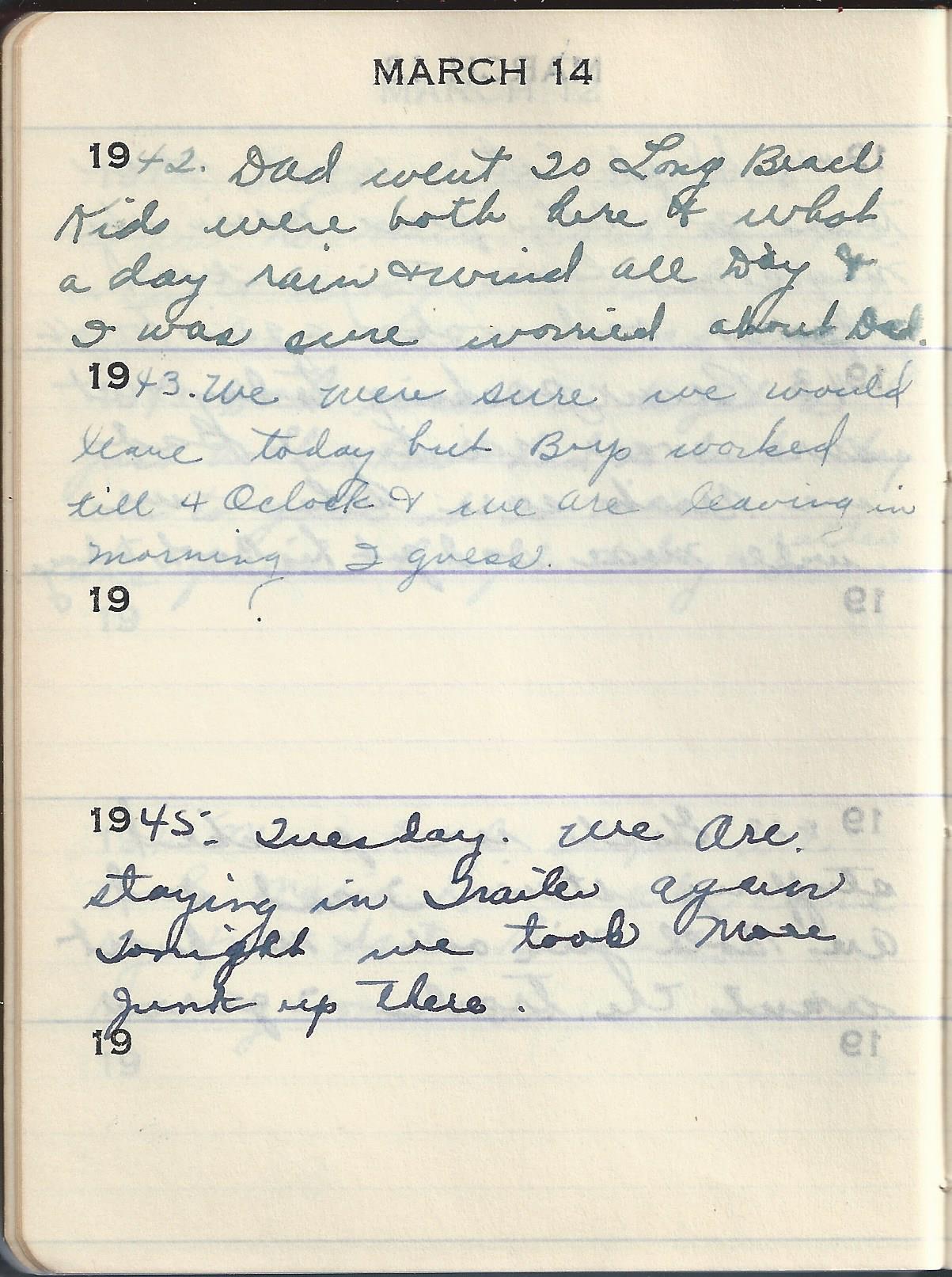 1942 Dad went To Long Beach Kids were both here & what a day rain & wind all Day & I was sure worried about Dad.