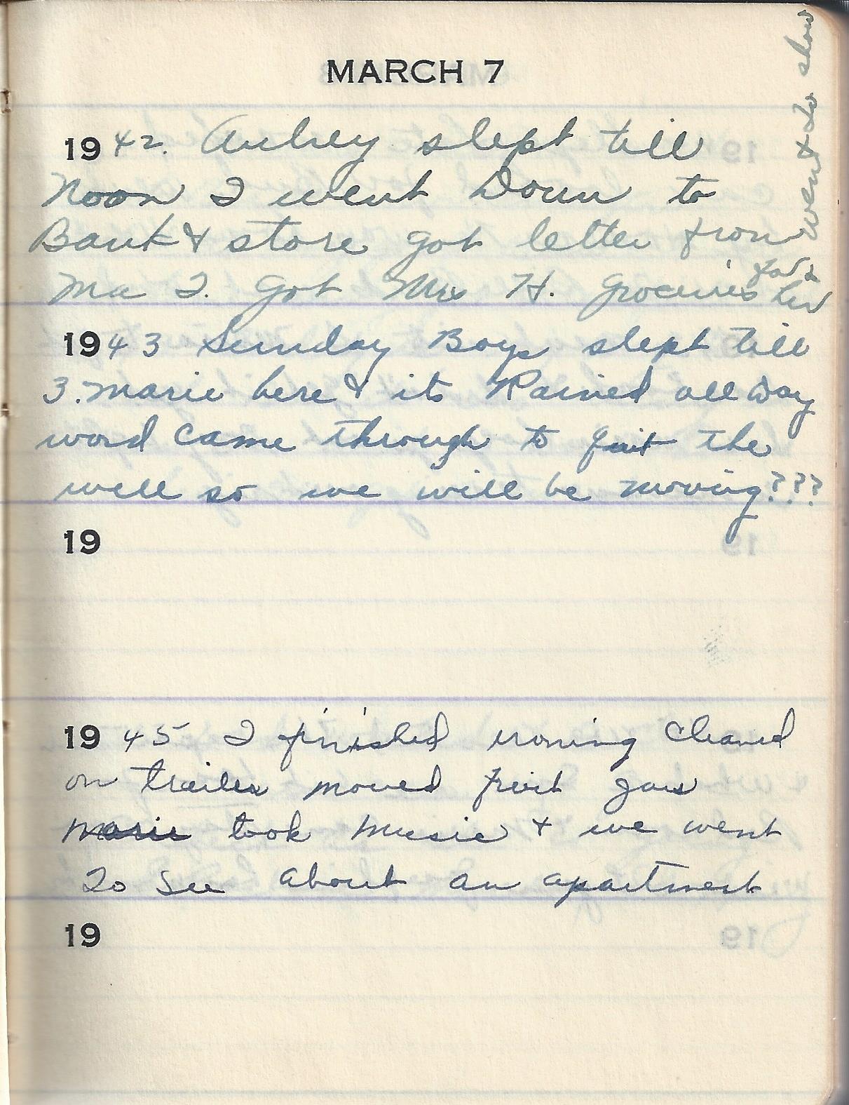1945 I finished ironing cleaned our trailer moved fruit jars took Marie & we went To See about an apartment