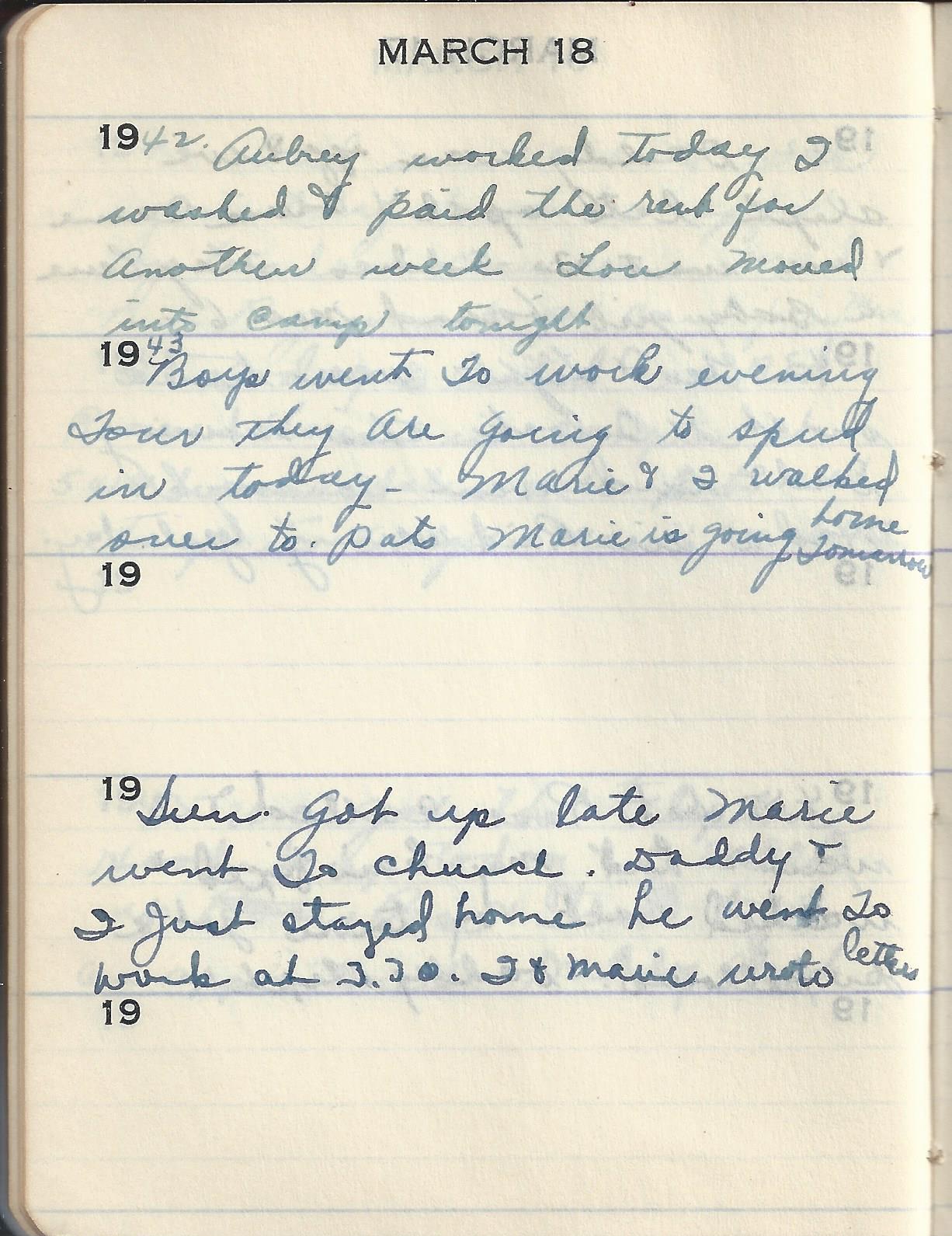 1942 Aubrey worked today I washed & paid the rent for Another week Lou Moved into Camp tonight