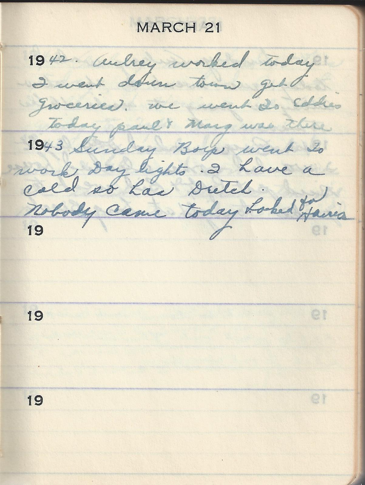 1942 Aubrey worked today I went down town got groceries. we went To Eddies today paul & Marg was there