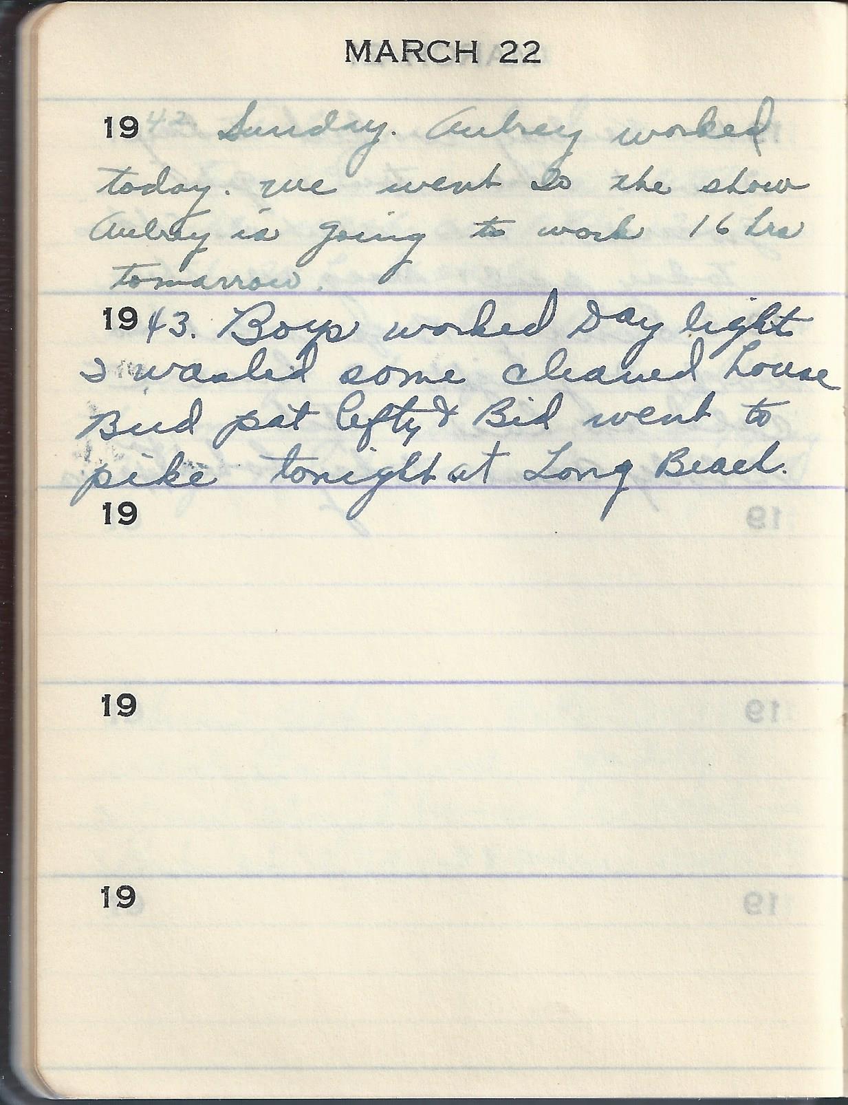 1943 Boys work Day lights I washed some cleaned house Bud Pat lefty & Bill went to pike tonight at Long Beach.