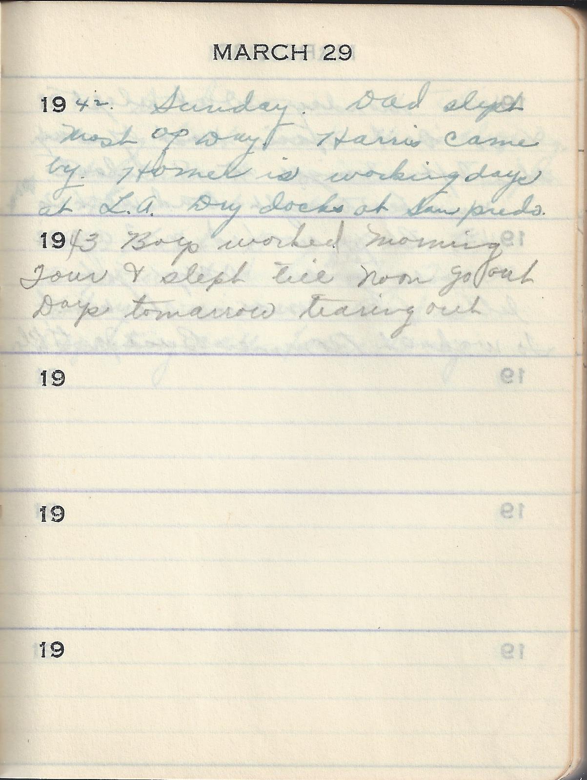 1942 Sunday. Dad slept Most of Day. Harris came by. Homer is working days at L.A. Dry docks at San Pedro.