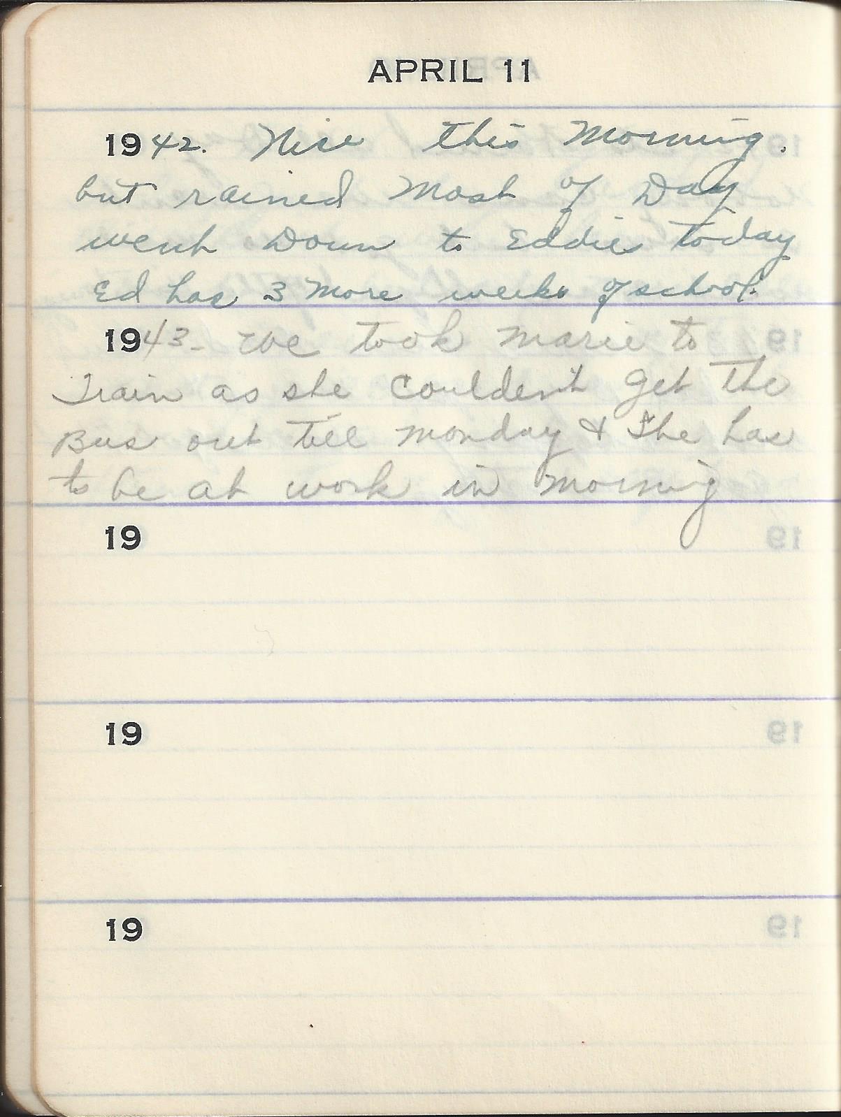 1942 Nice this morning. but rained Most of Day went Down to Eddie today Ed has 3 More weeks of school.