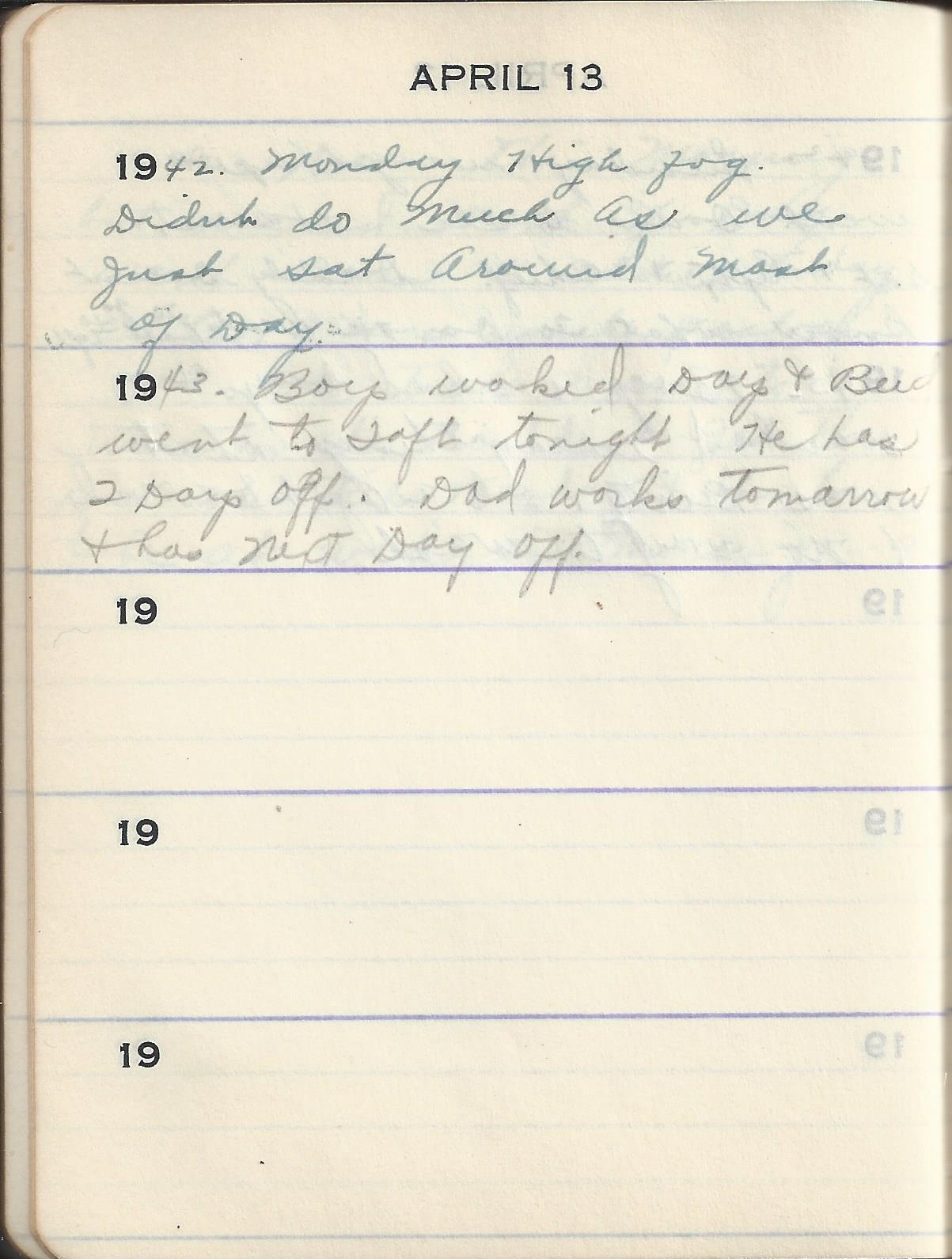 1942 Monday High fog. Didn’t do Much As we Just sat Around Most of Day.