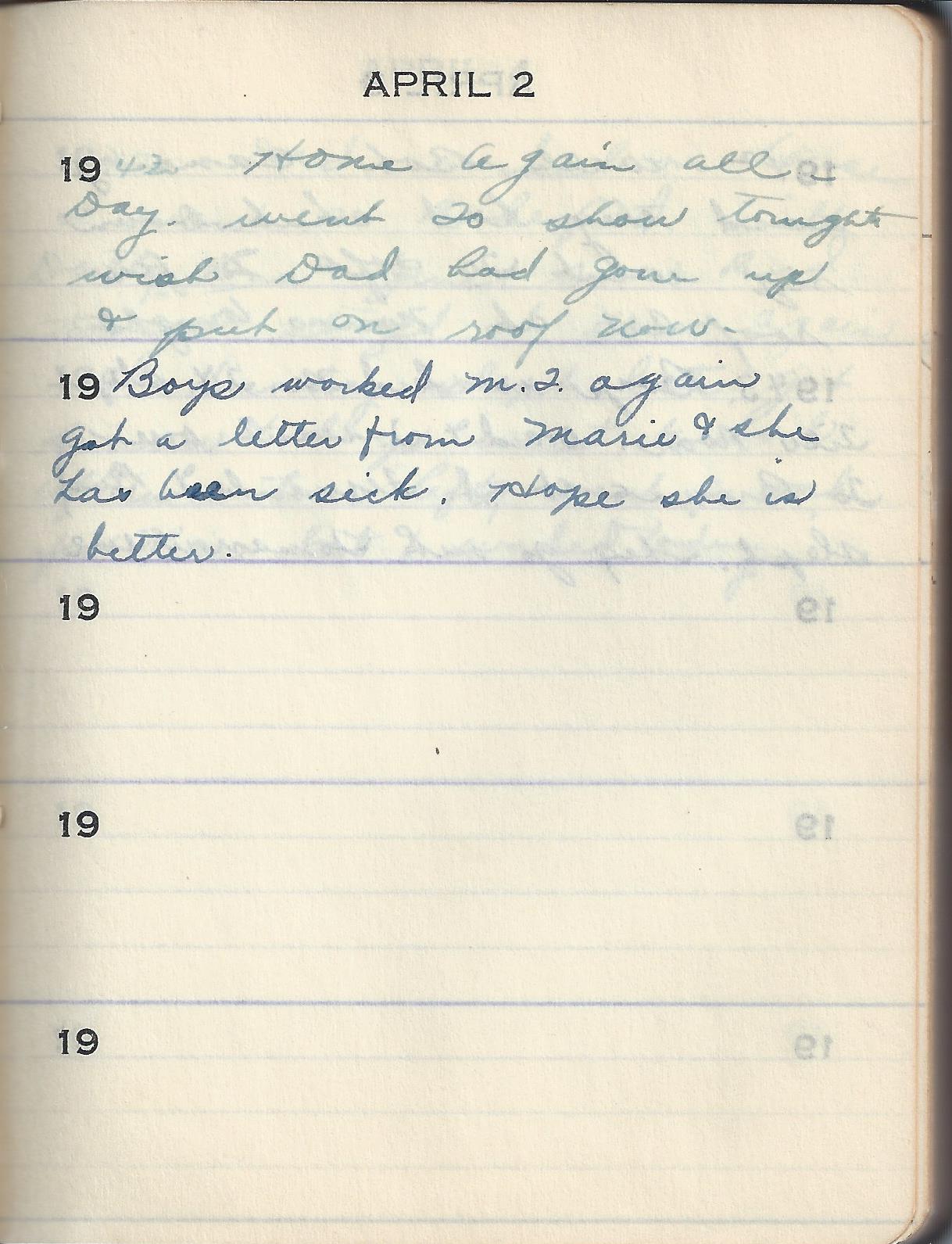 1943 Boys worked M.T. again got a letter from Marie & she has been sick. Hope she is better.