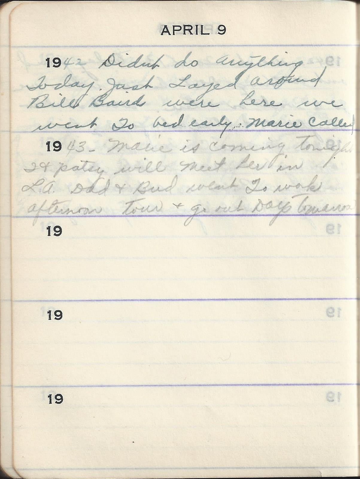 1943 Marie is coming tonight * & patsy will Meet her in L.A. Dad & Bud went To work afternoon tour & go out Days tomorrow.
