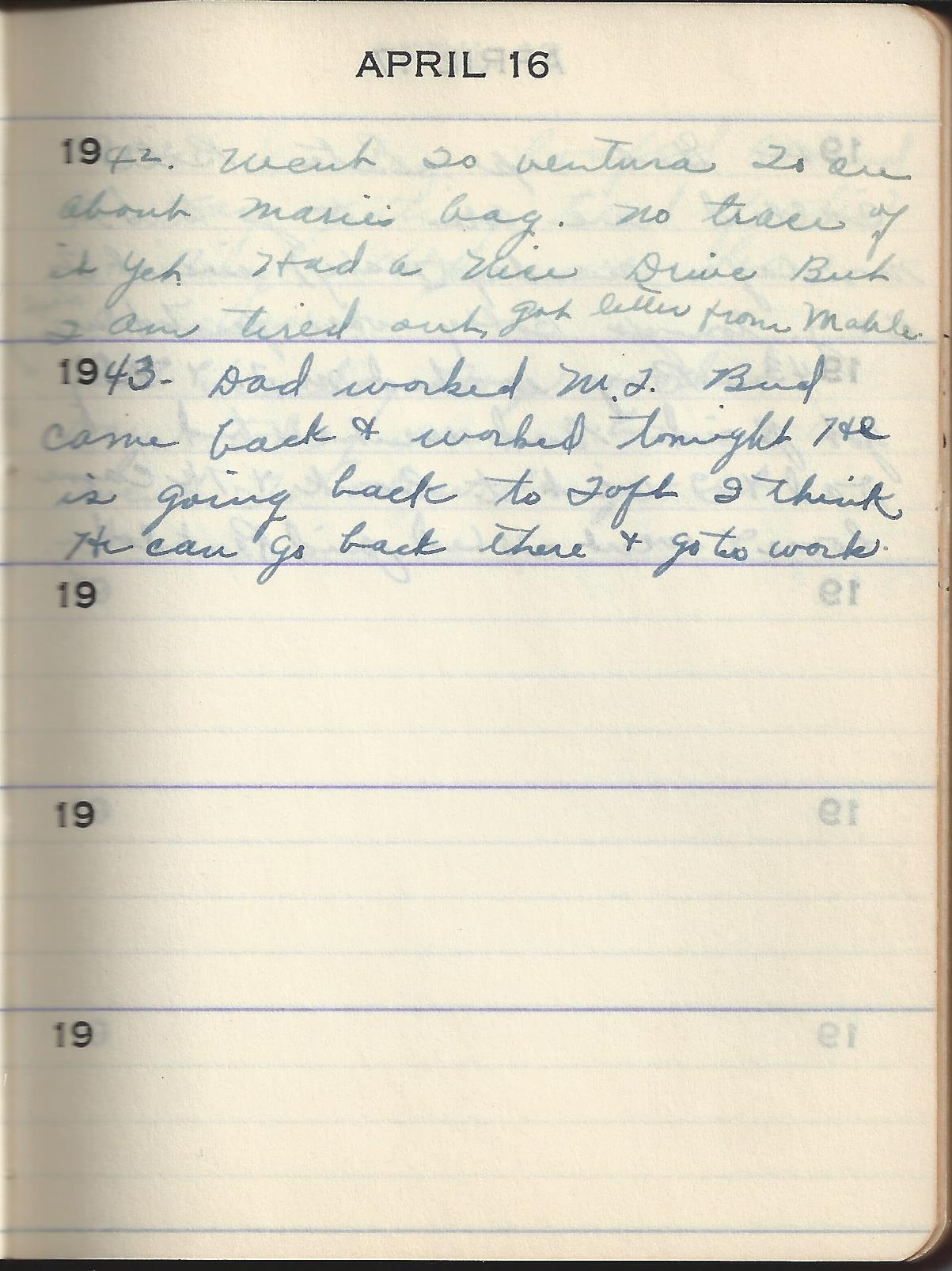 1943 Dad worked M.T. Bud came back & worked tonight He is going back to Taft I think He can go back there & go to work.