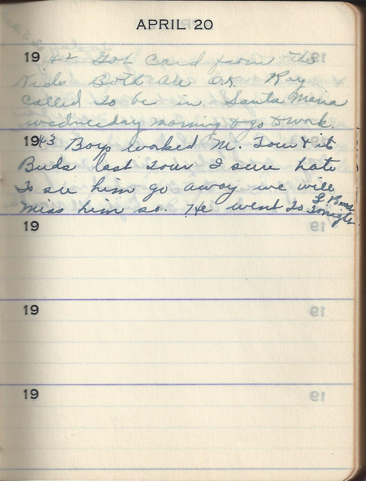 1943 Boys worked M. Tour & its Buds last Tour I sure hate To see him go away we will Miss him so. He went To L. Beach Tonight
