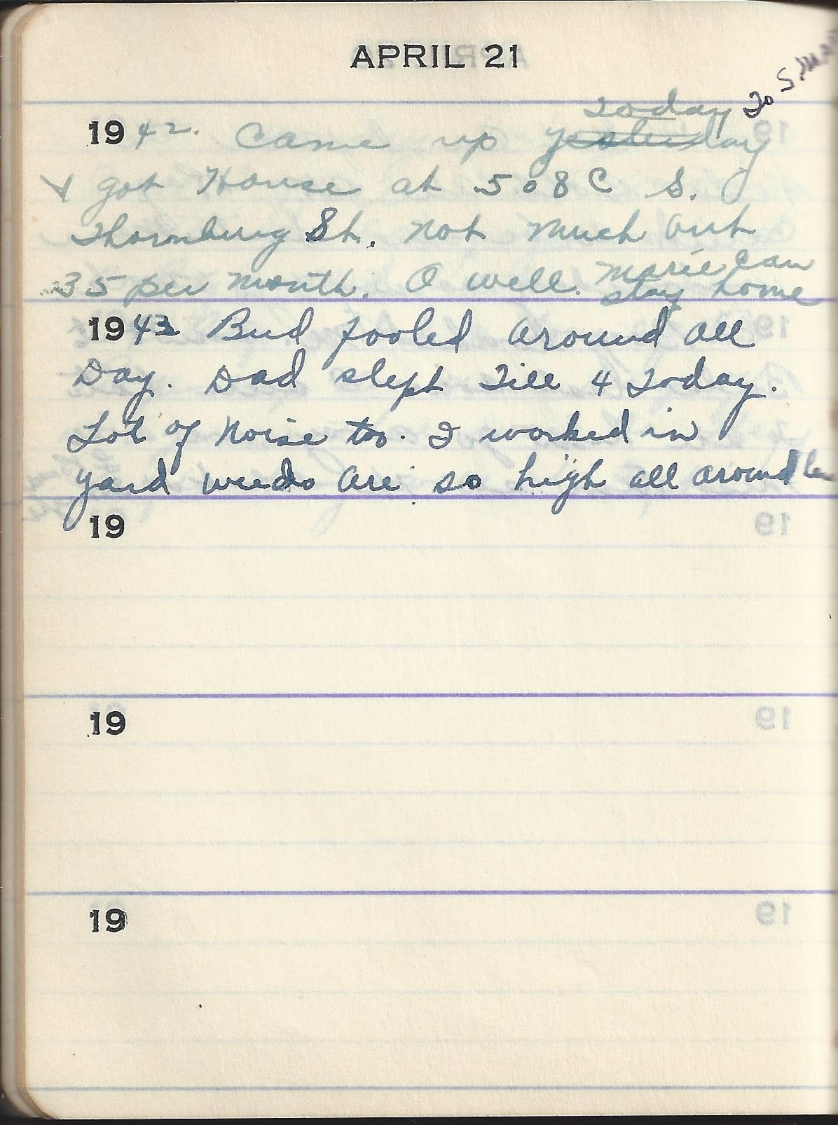 1942 Came up yesterday Today To S. Maria & got House at 508C S. Thornburg St. Not much but 35 per Month. O well. Marie can stay home.