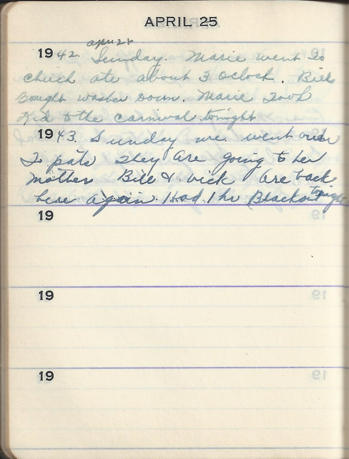 1942 Apr 26 Sunday. Marie went To church ate about 3 oclock. Bills Brought washer Down. Marie Took Kids to the carnival tonight