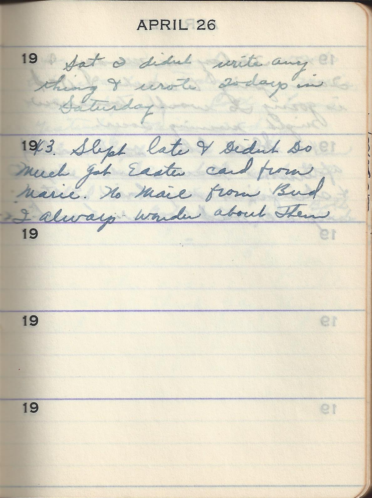 1943 Slept late & Didnt Do Much got Easter card from Marie. No Mail from Bud I always wonder about them