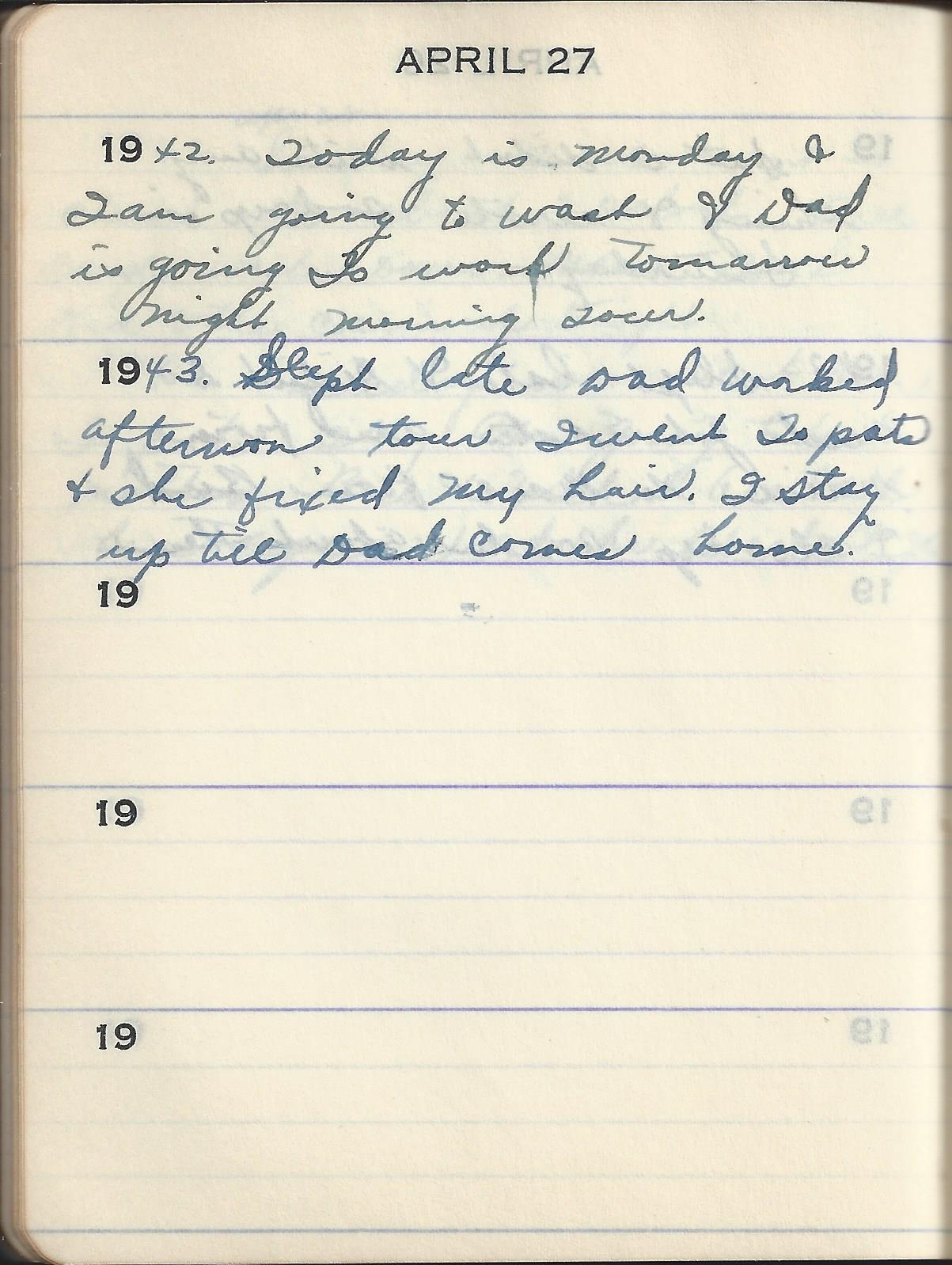 1943 Slept late Dad worked afternoon tour I went To pats & she fixed My hair. I stay up till Dad comes home.