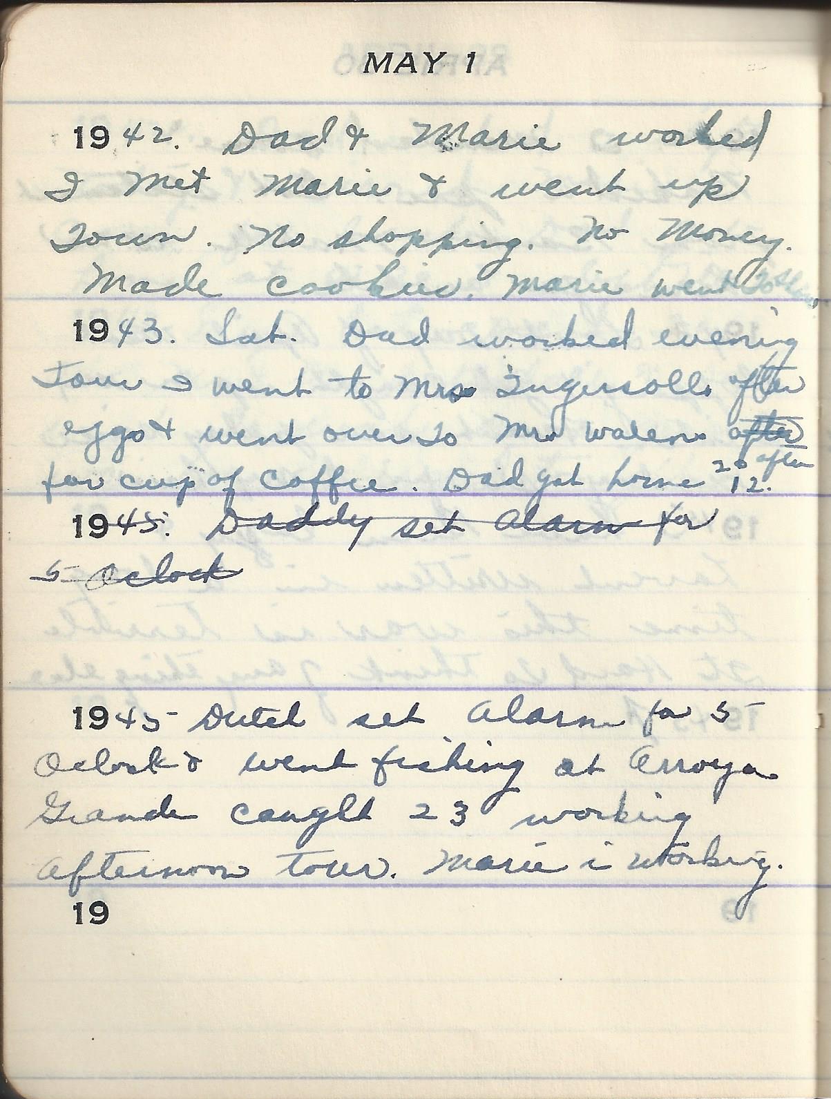 1945 Dutch set alarm for 5 oclock & went fishing at Arroyo Grande caught 23 working afternoon tour. Marie is working.