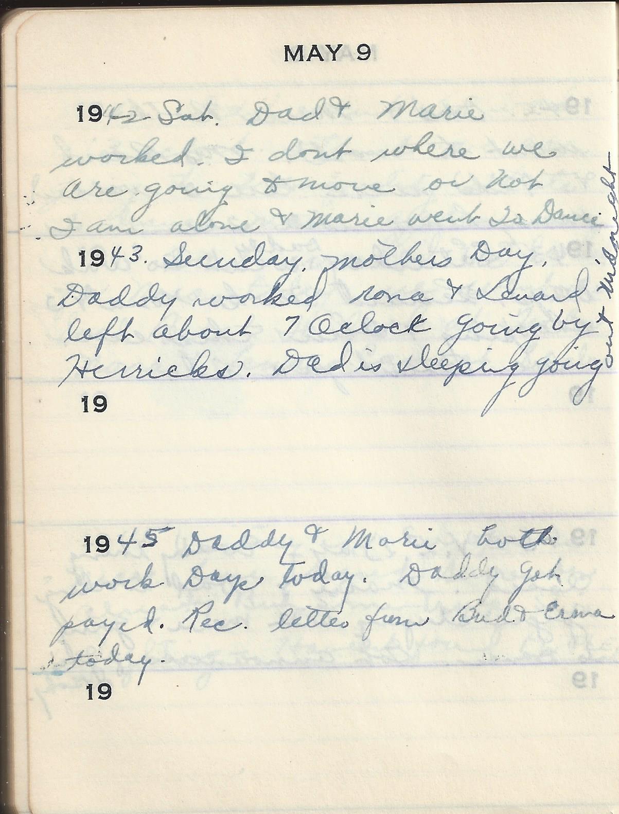 1943 Sunday. Mothers Day. Daddy worked Nona & Lenard left about 7 Oclock going by Herricks. Dad is sleeping going out Midnight