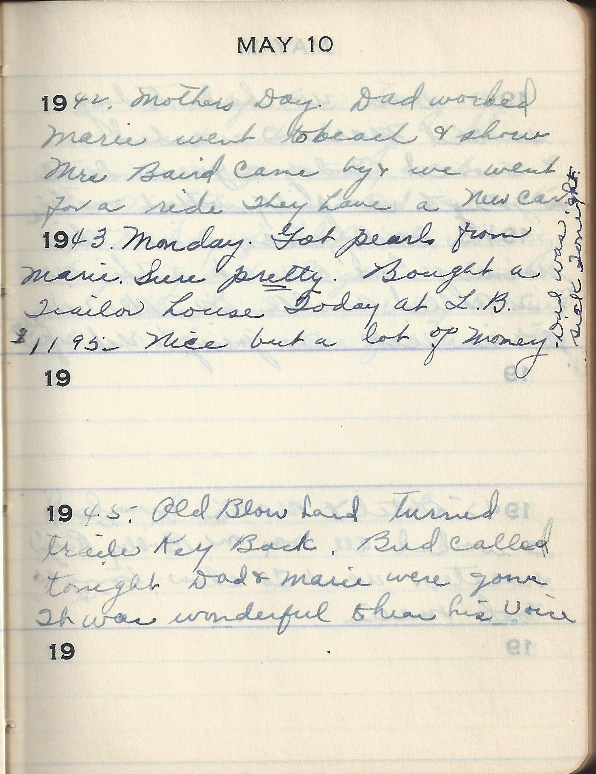 1942 Mothers Day. Dad worked Marie went to beach & show Mrs Baird came by & we went for a ride they have a New car