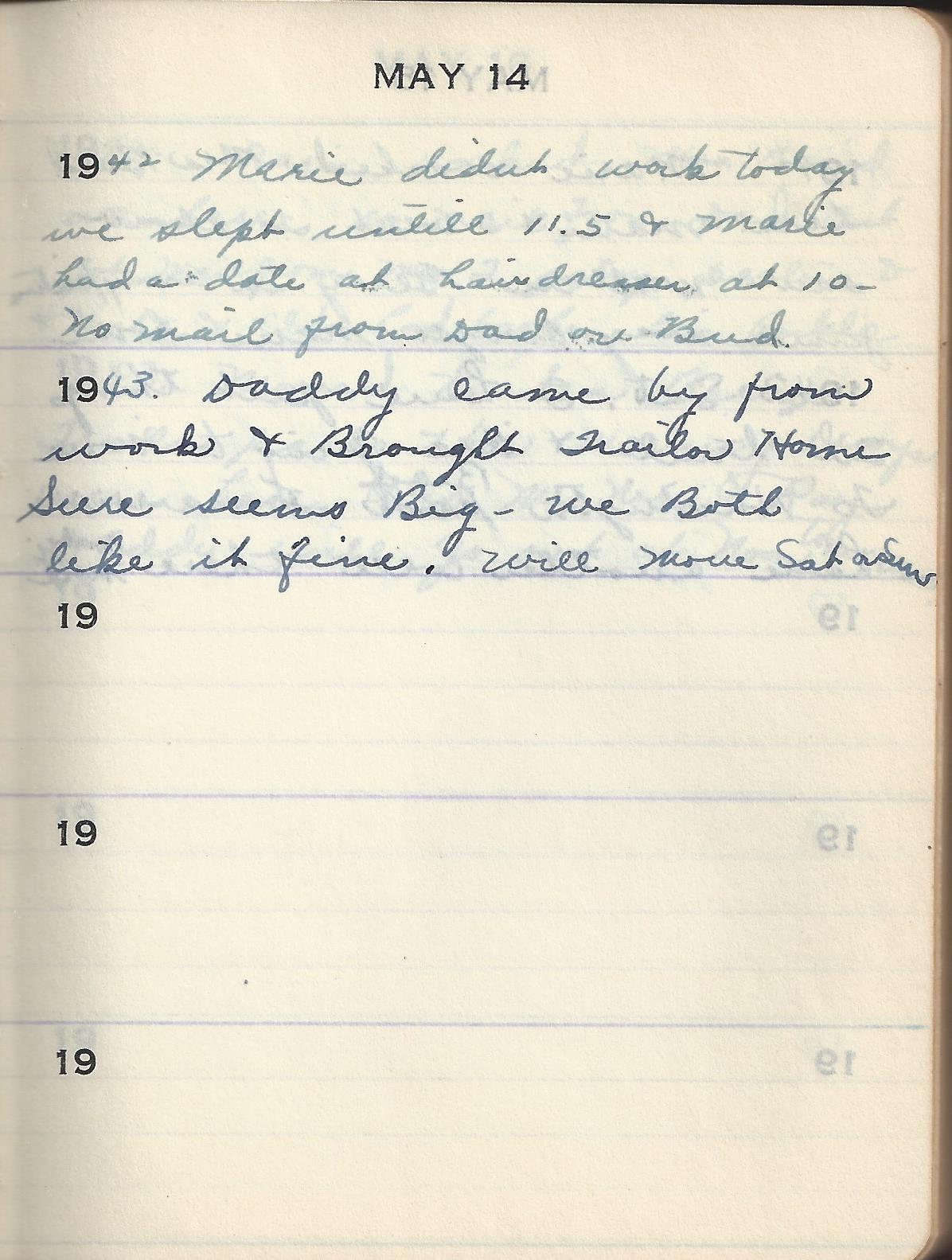 1943 Daddy came by from work & Brought Trailor Home Sure seems Big – We Both like it fine. Will Move Sat ???