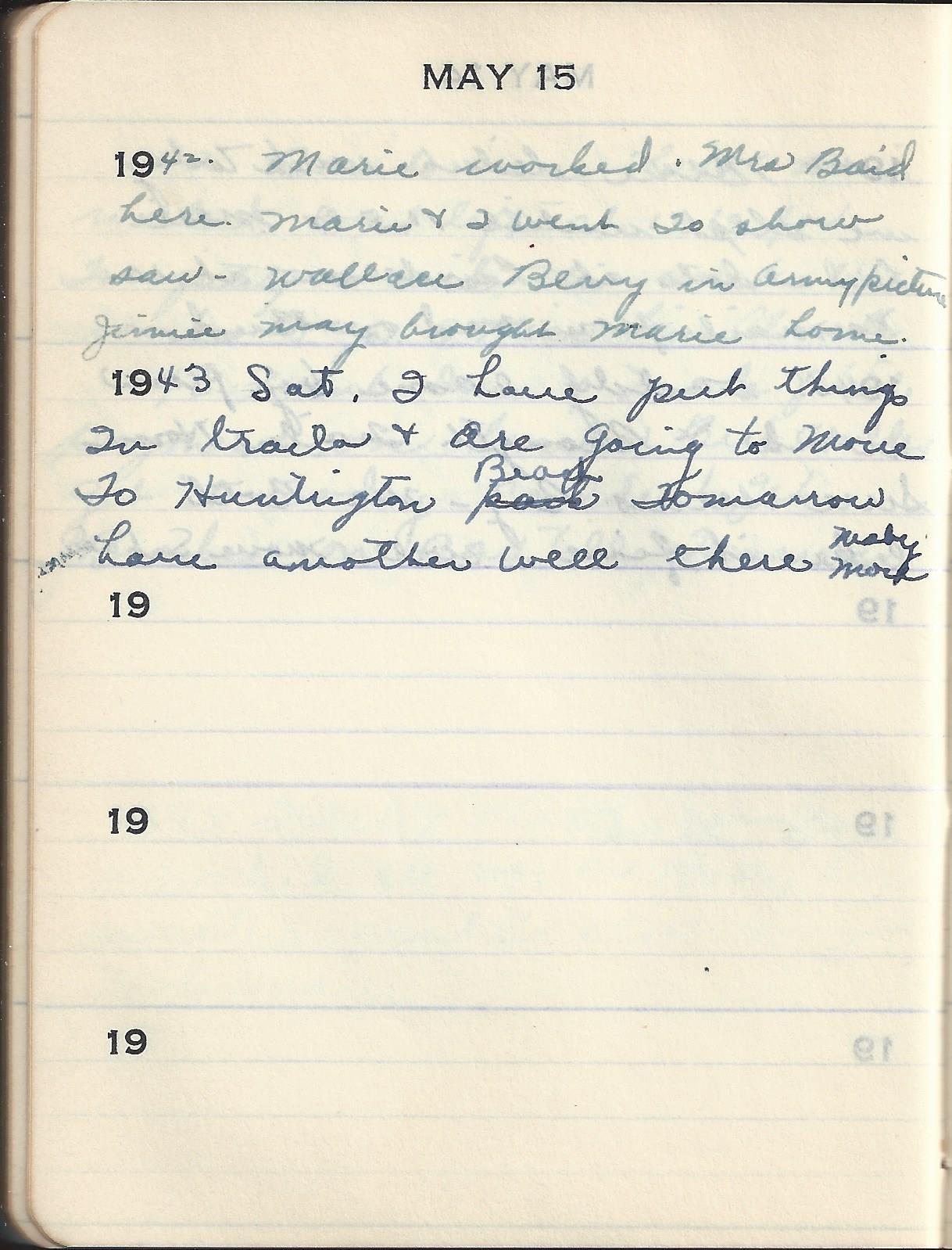 1942 Marie worked. Mrs Baird here Marie & I went To show saw – Wallace Berry in army picture Jimmie May brought Marie home.