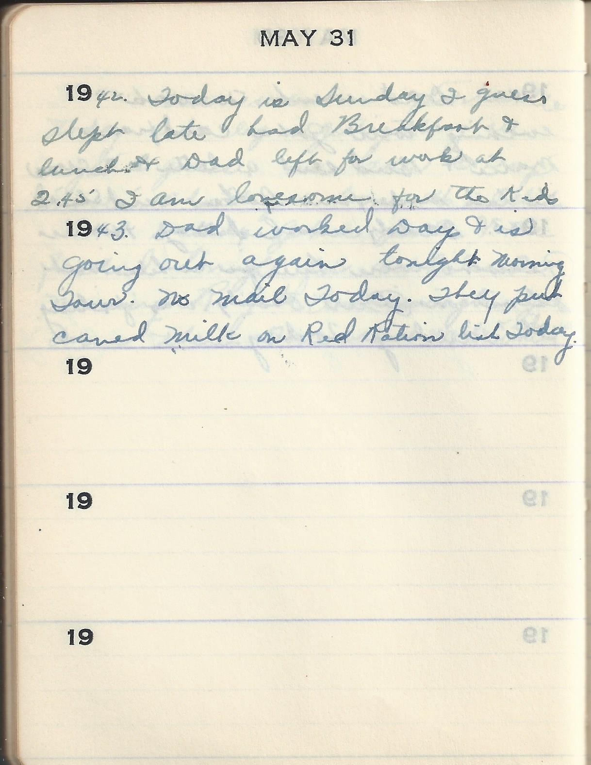 1943 Dad worked Days & is going out again tonight Morning Tour. No Mail Today. They put caned Milk on Red Ration list Today.