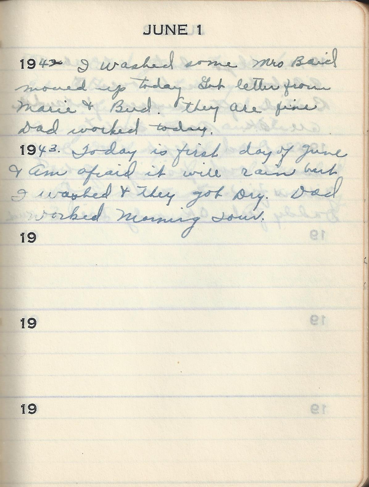 1943 Today is first day of June & Am afraid it will rain but I washed & they got Dry. Dad worked Morning Tour.
