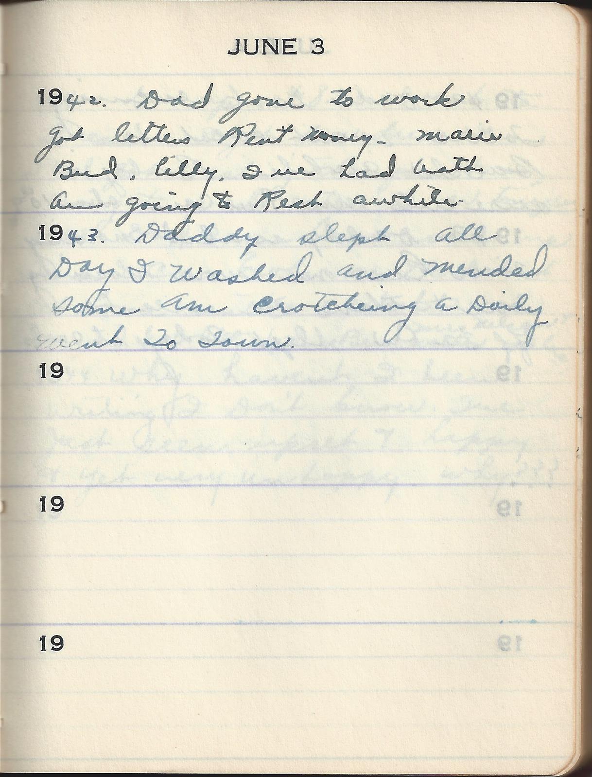 1943 Daddy slept all Day I washed and Mended some am crotcheing a Doily went To Town.