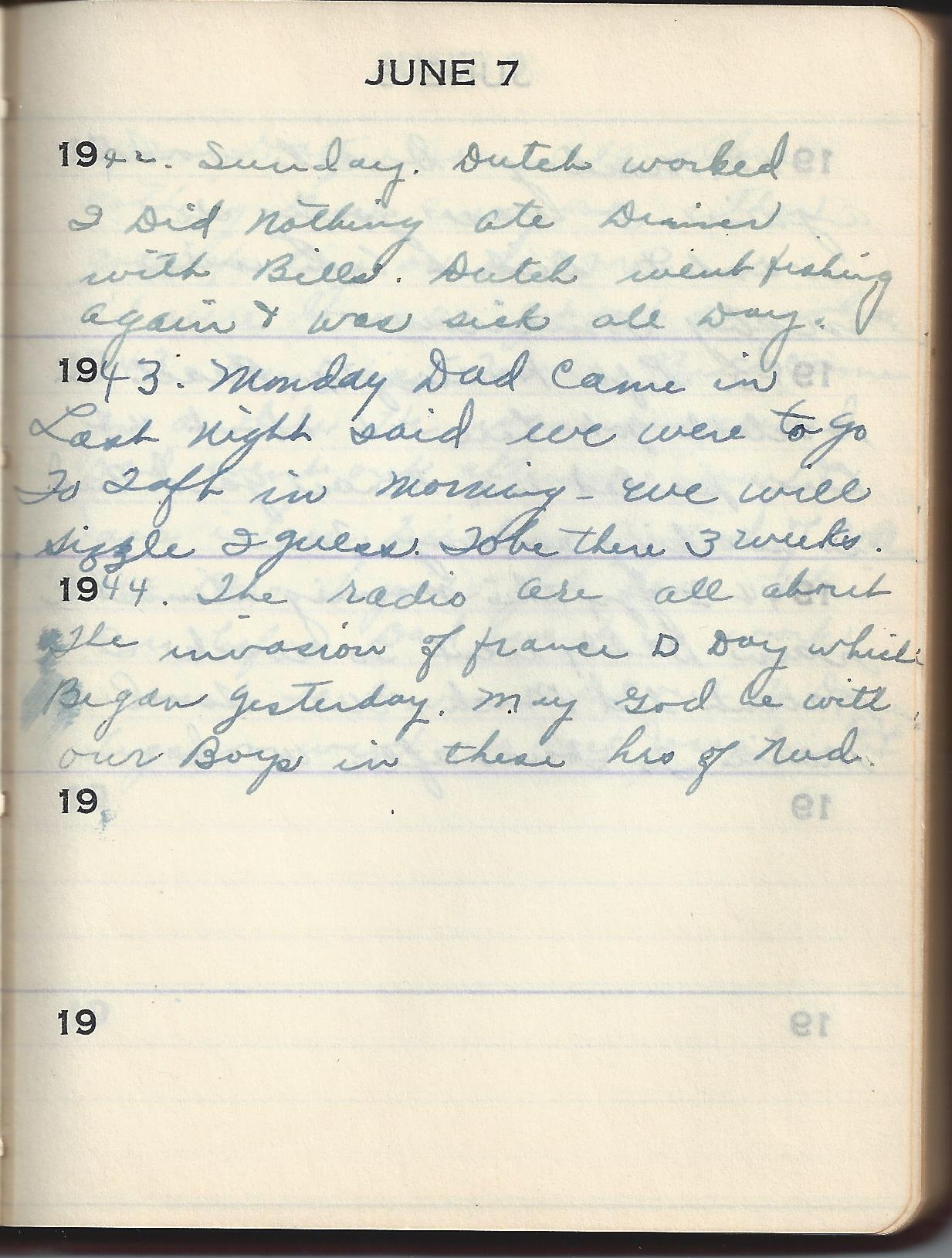 1944 The radio are all about the invasion of france D Day which Began yesterday. May God be with our Boys in these hrs of Need.