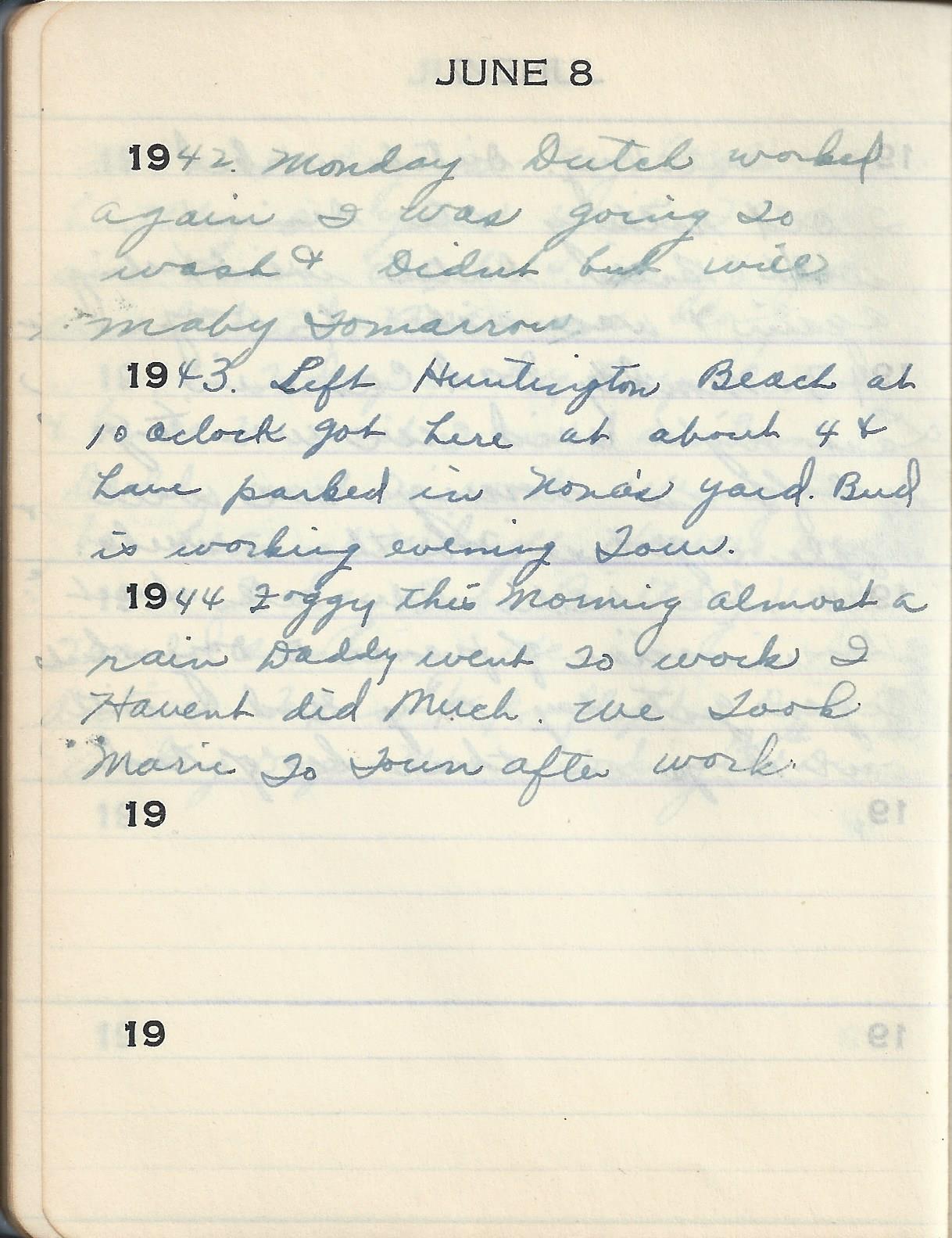 1943 Left Huntington Beach at 10 Oclock got here at about 4 & have parked in Nonas yard. Bud is working evening Tour.
